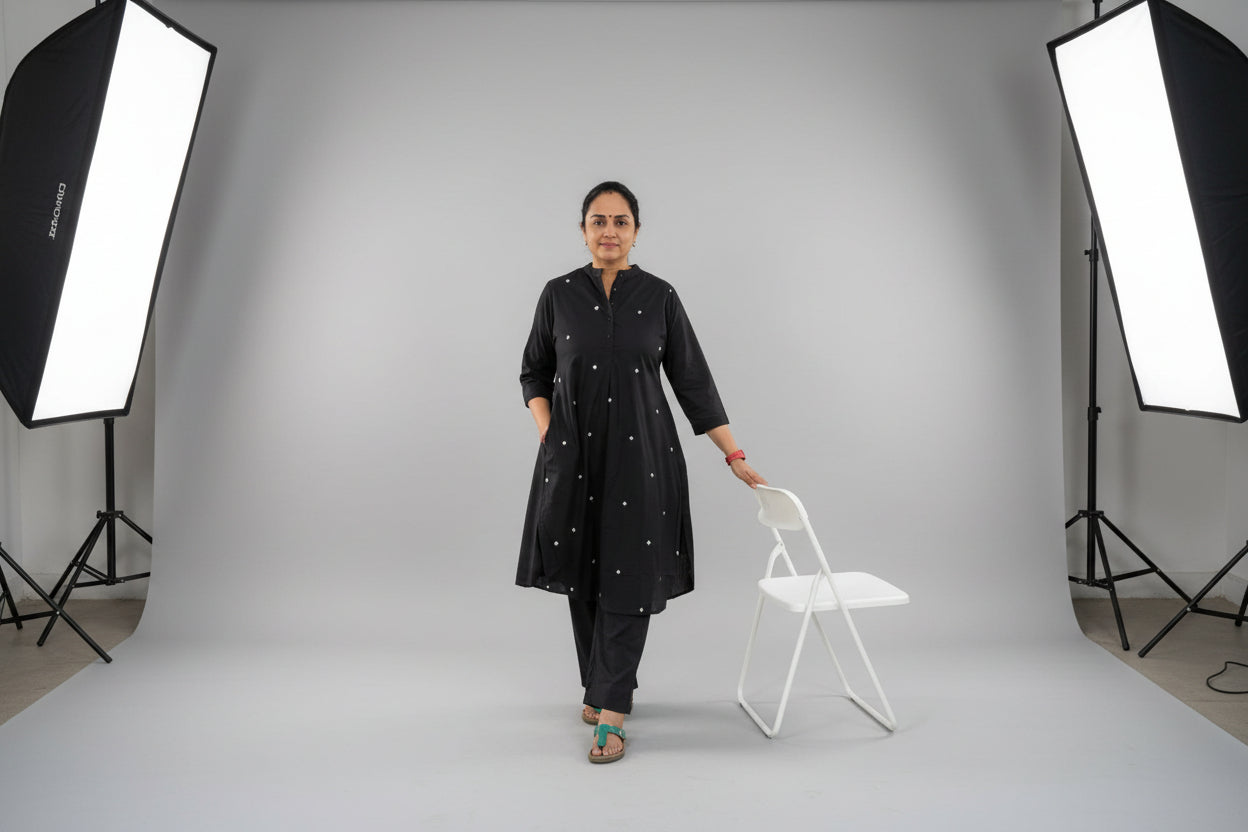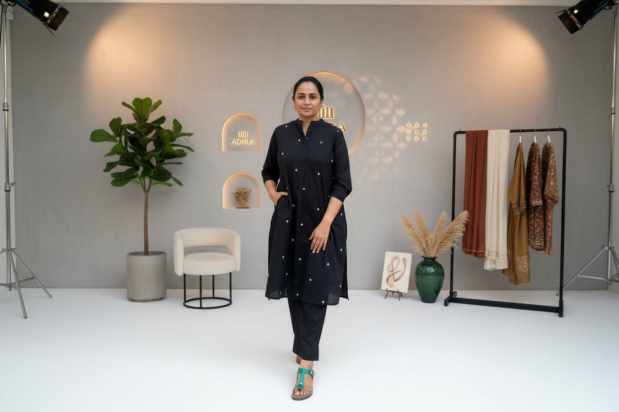 Midnight Black Cotton Co-Ord Set with Diamond Butti Print