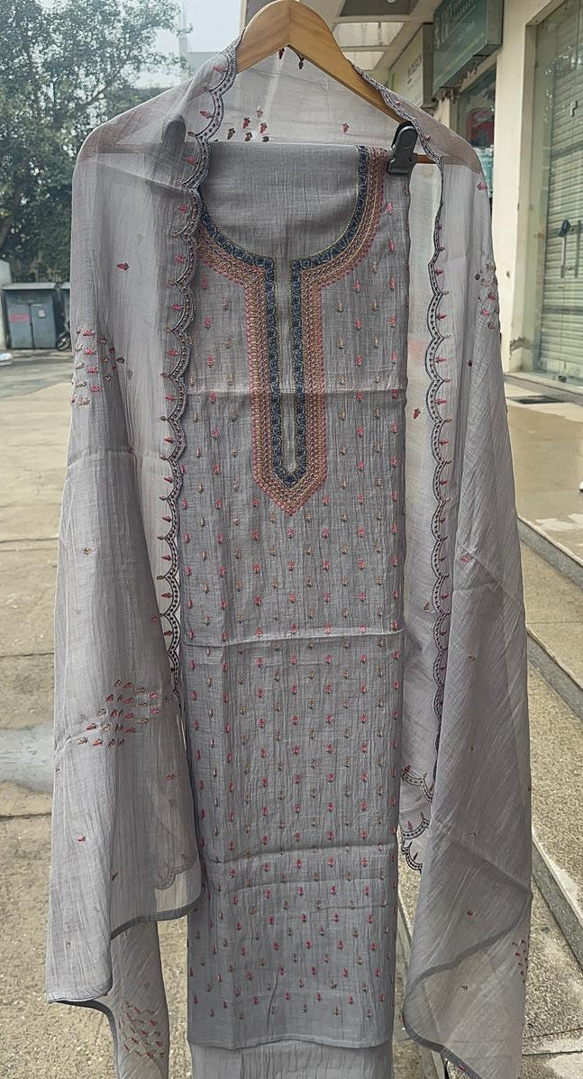 Chanderi Blend Suit Set with Embroidered Neckline & Scalloped Dupatta
