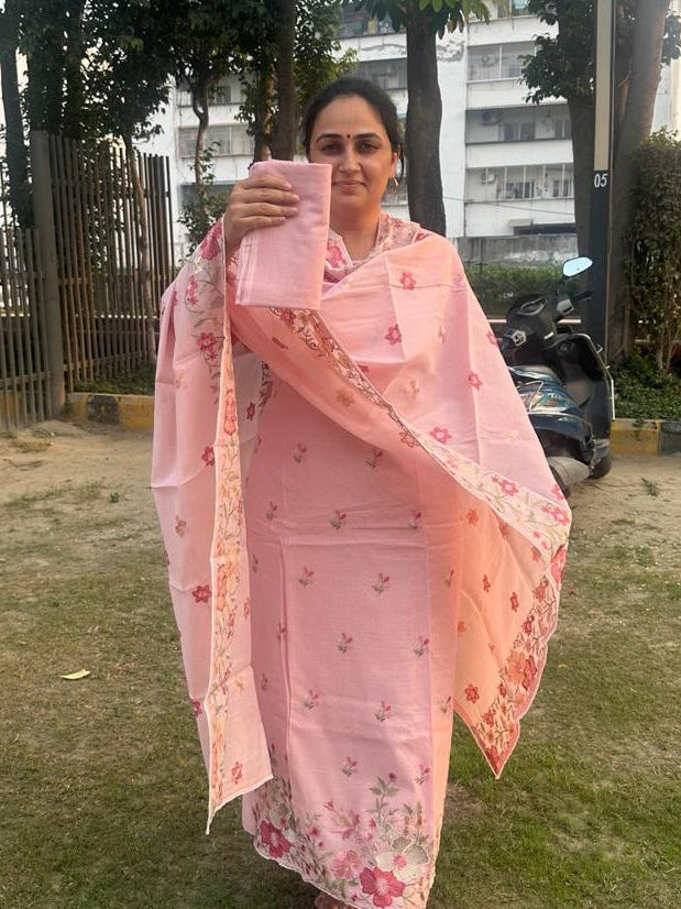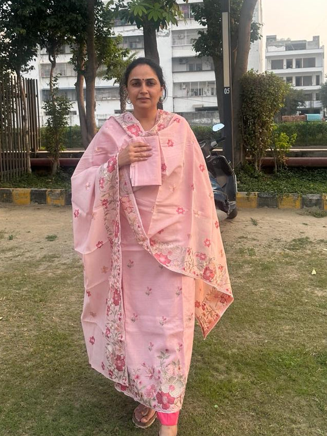 Elegant Floral Embroidered Linen Suit with Crochet Lace Detaling