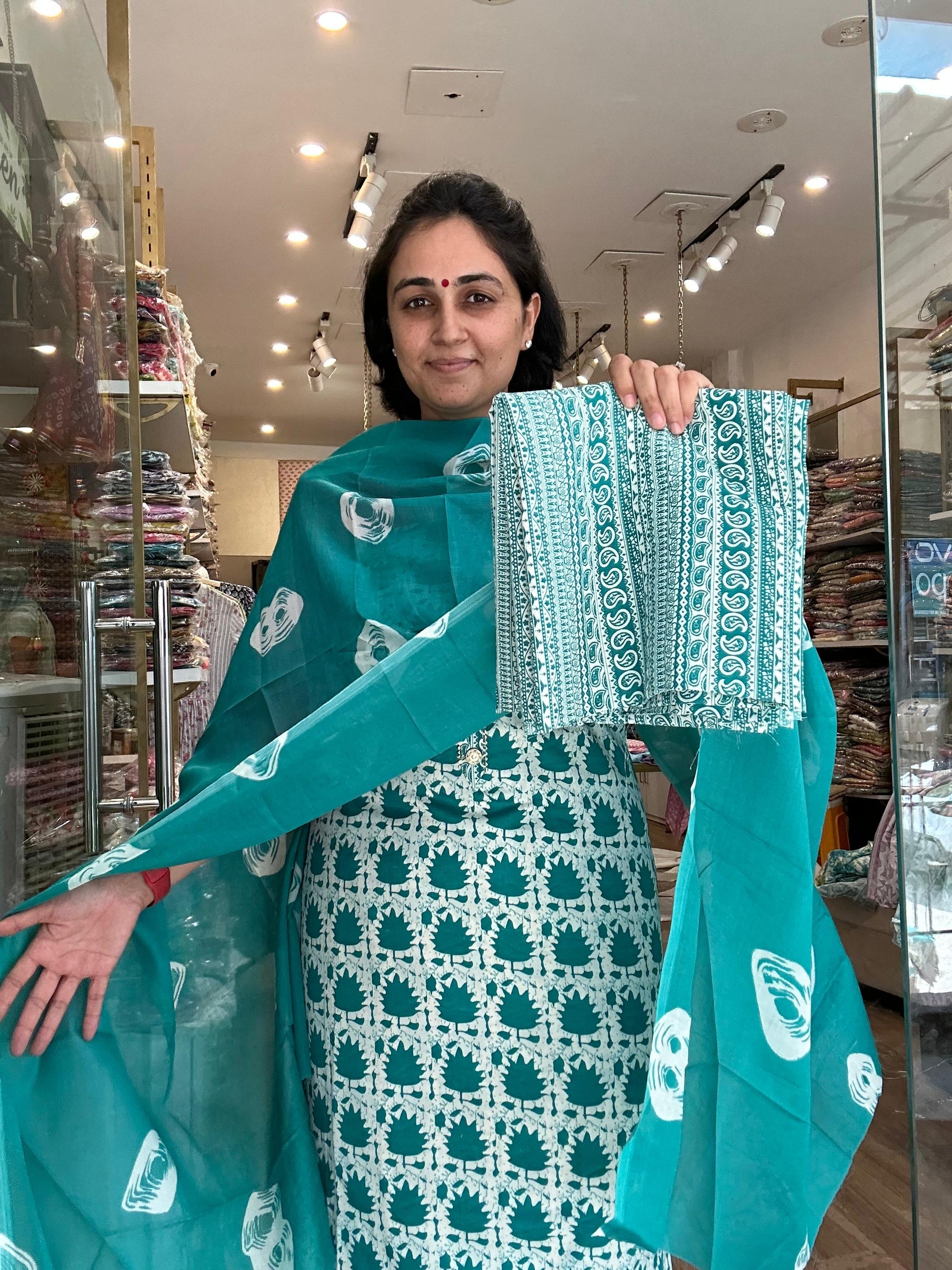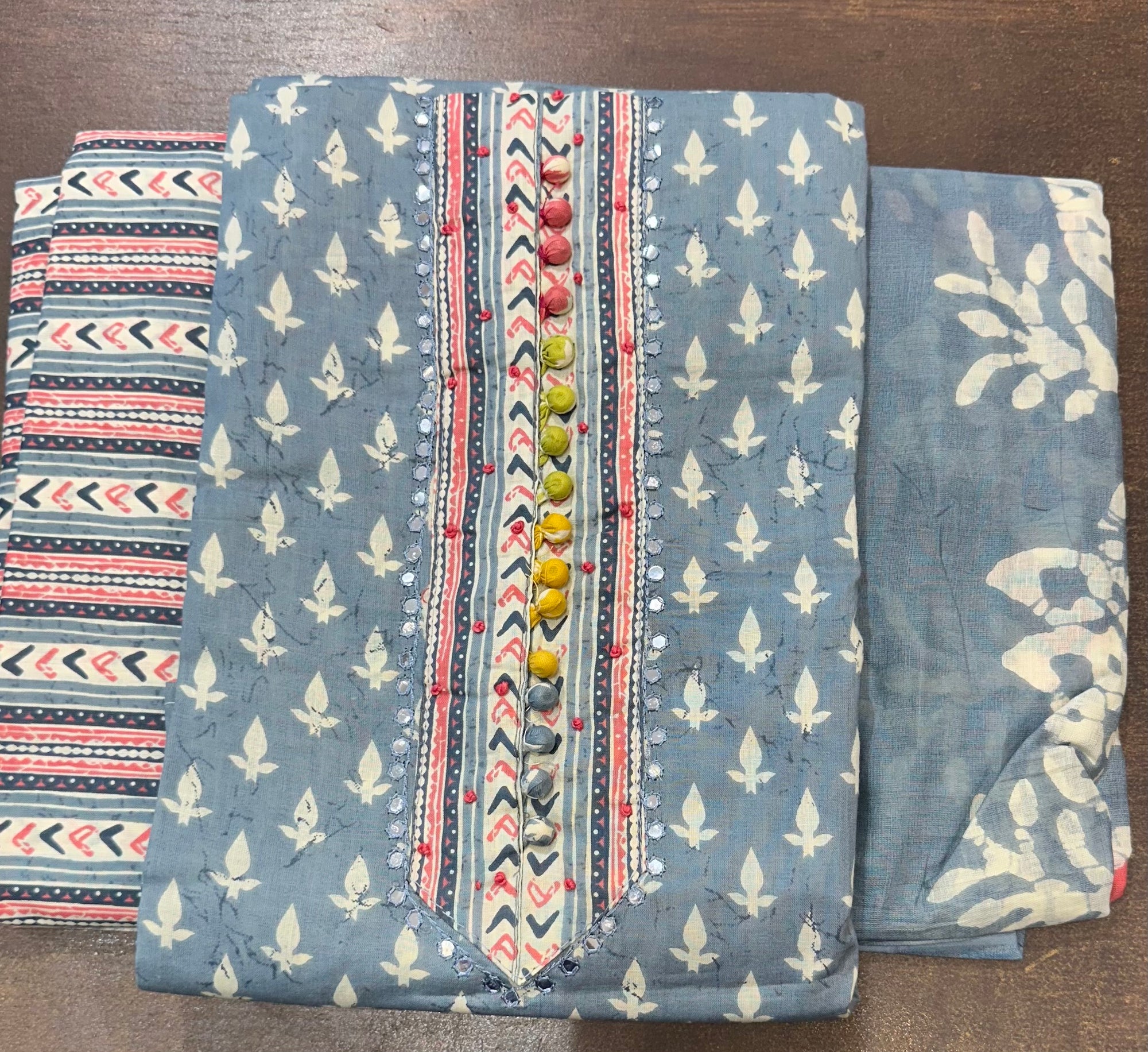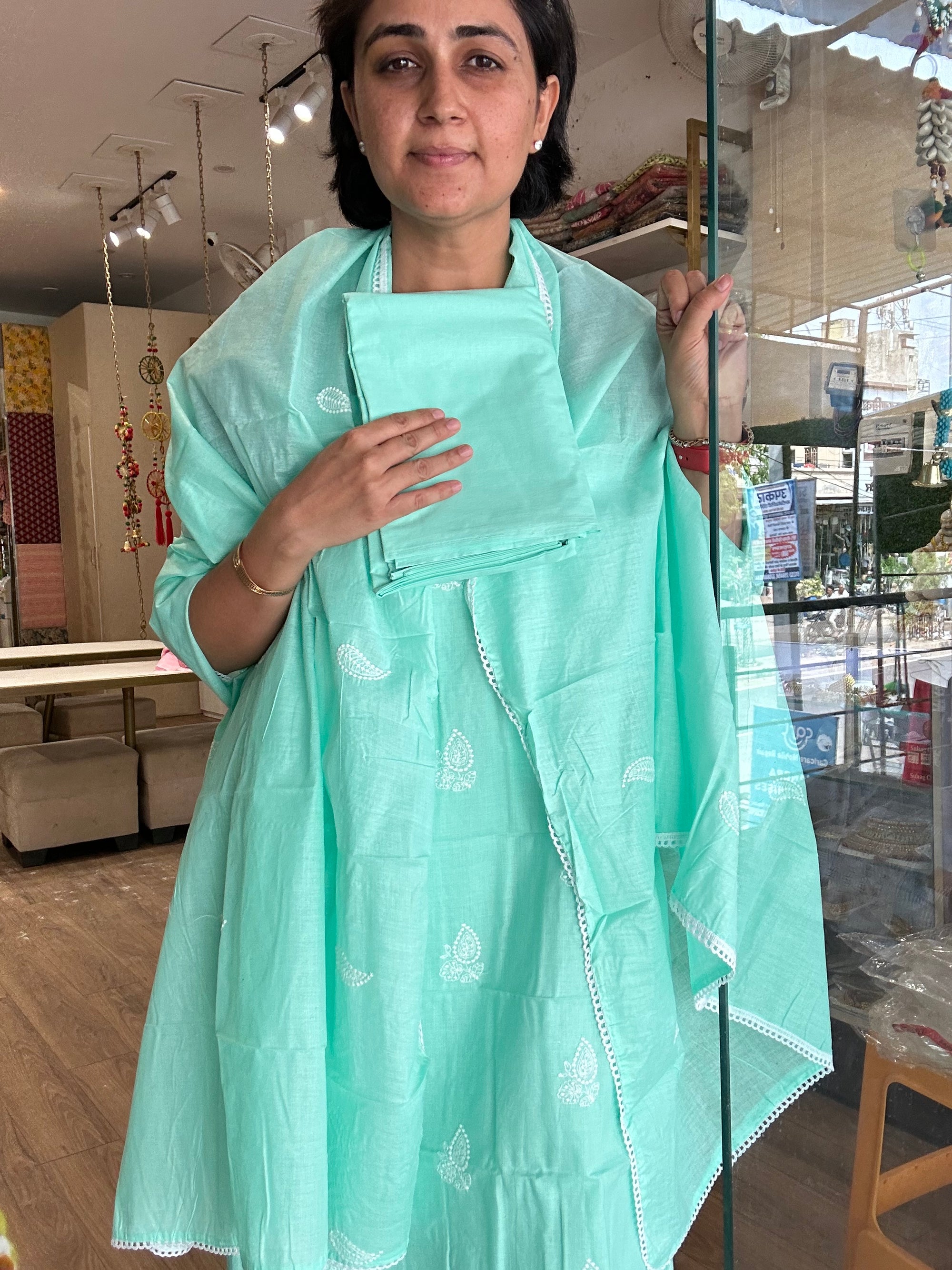 Elegant Cotton Printed Suit Set with Lace & Mirror Work – Multiple Shades
