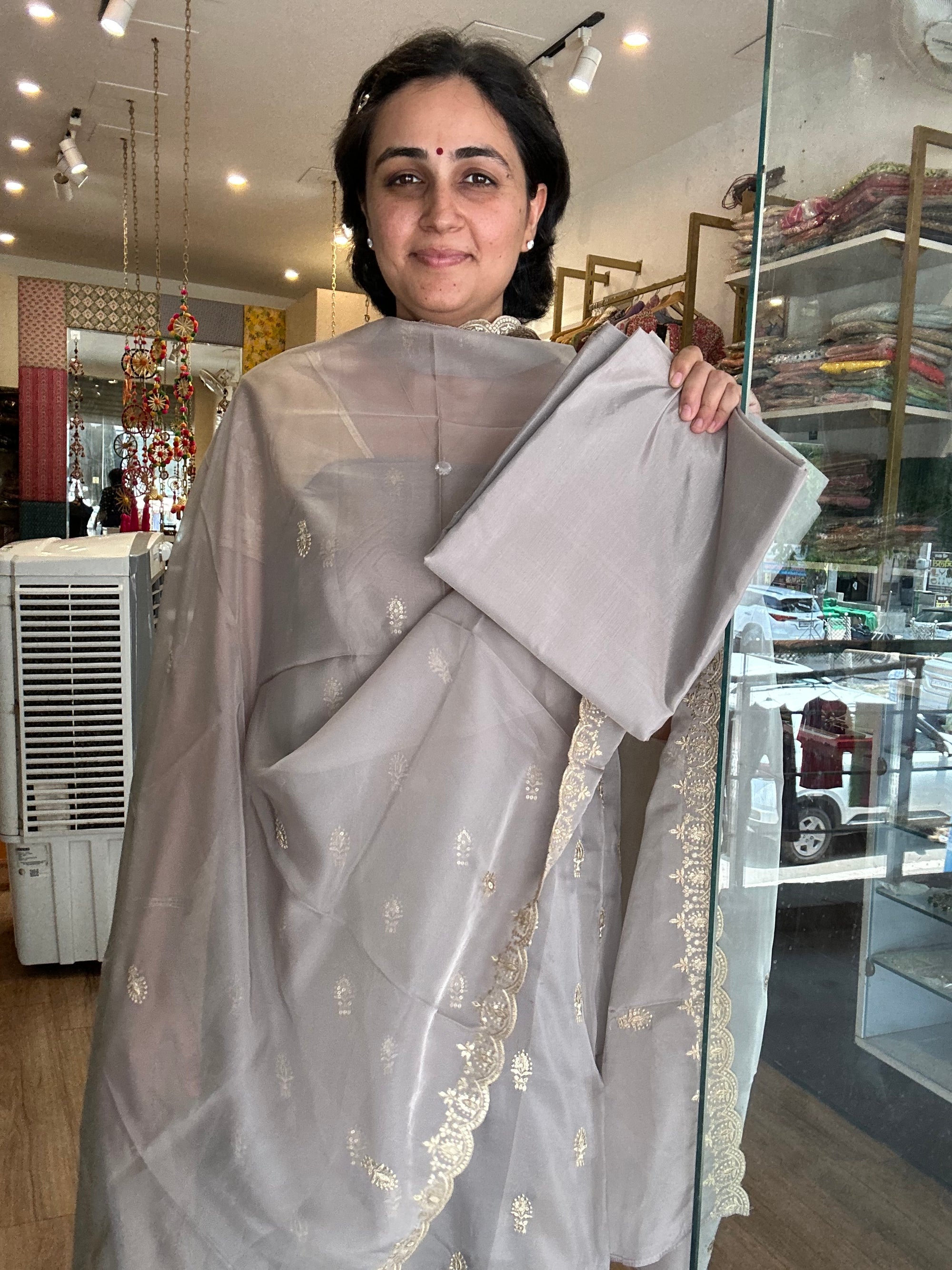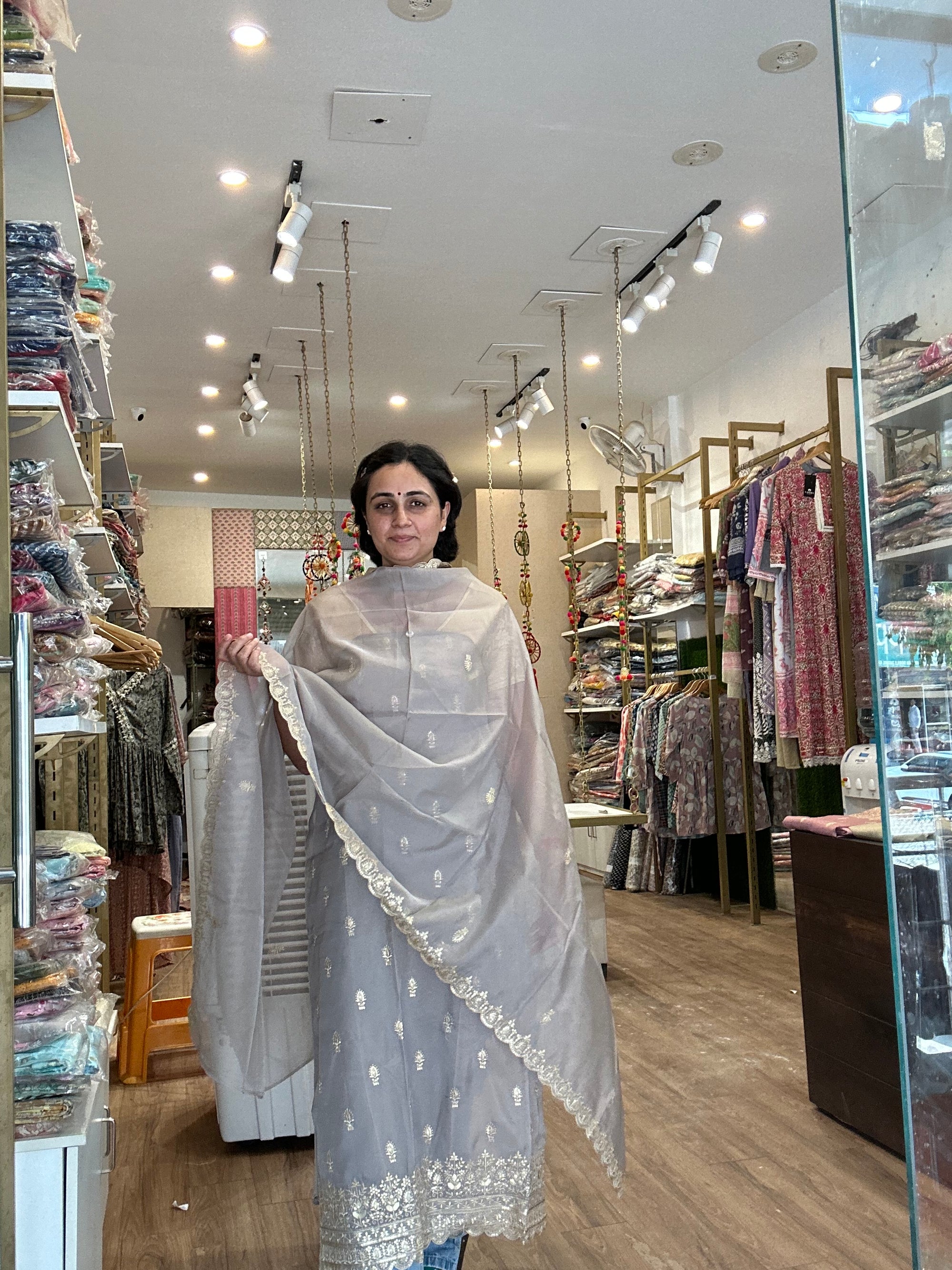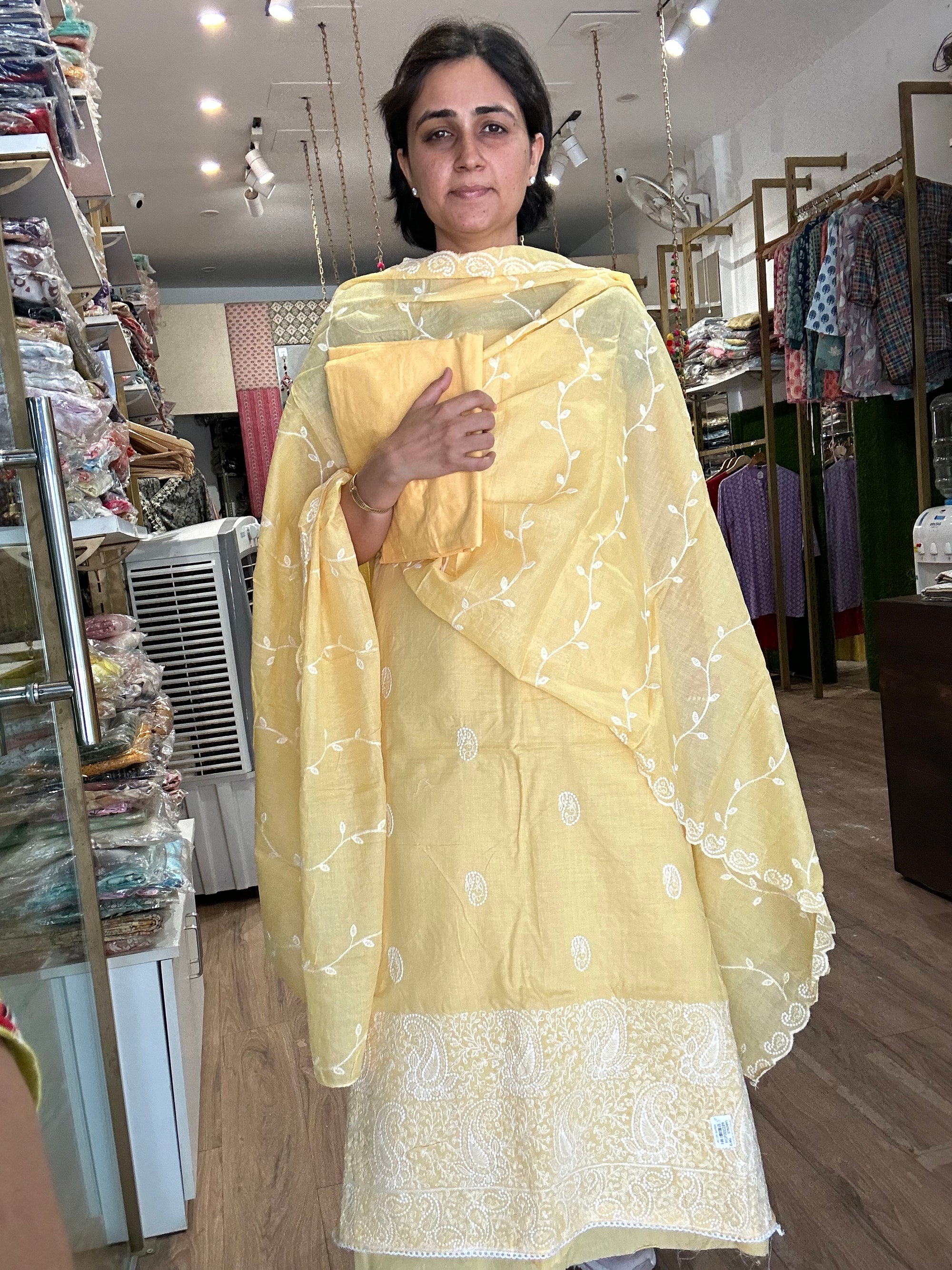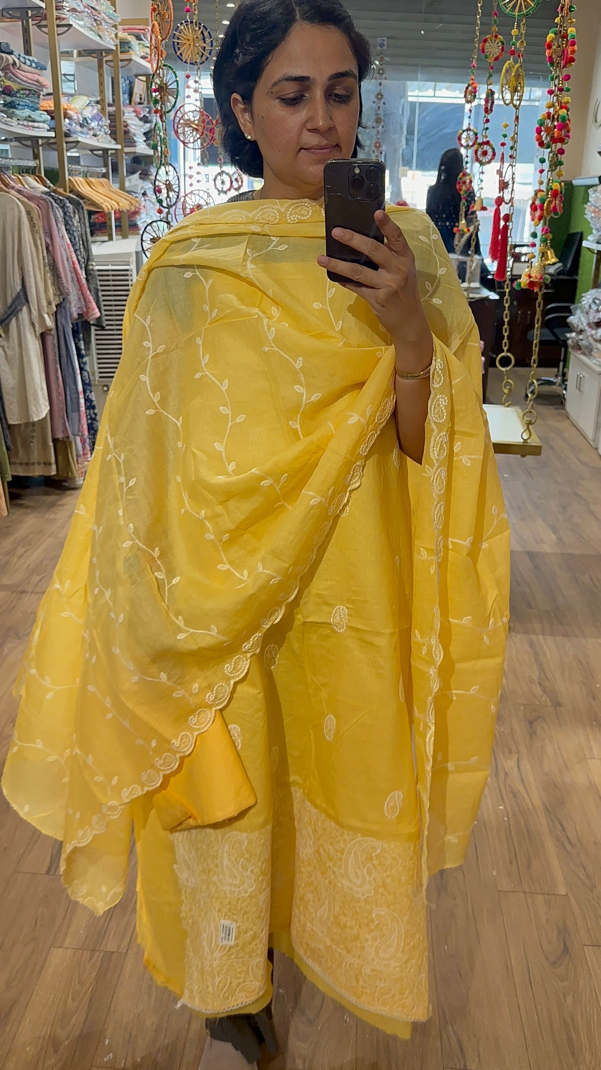 Ethereal Daisies - White, Grey, and Yellow Chikankari Dupatta Set by Vastra by Monty
