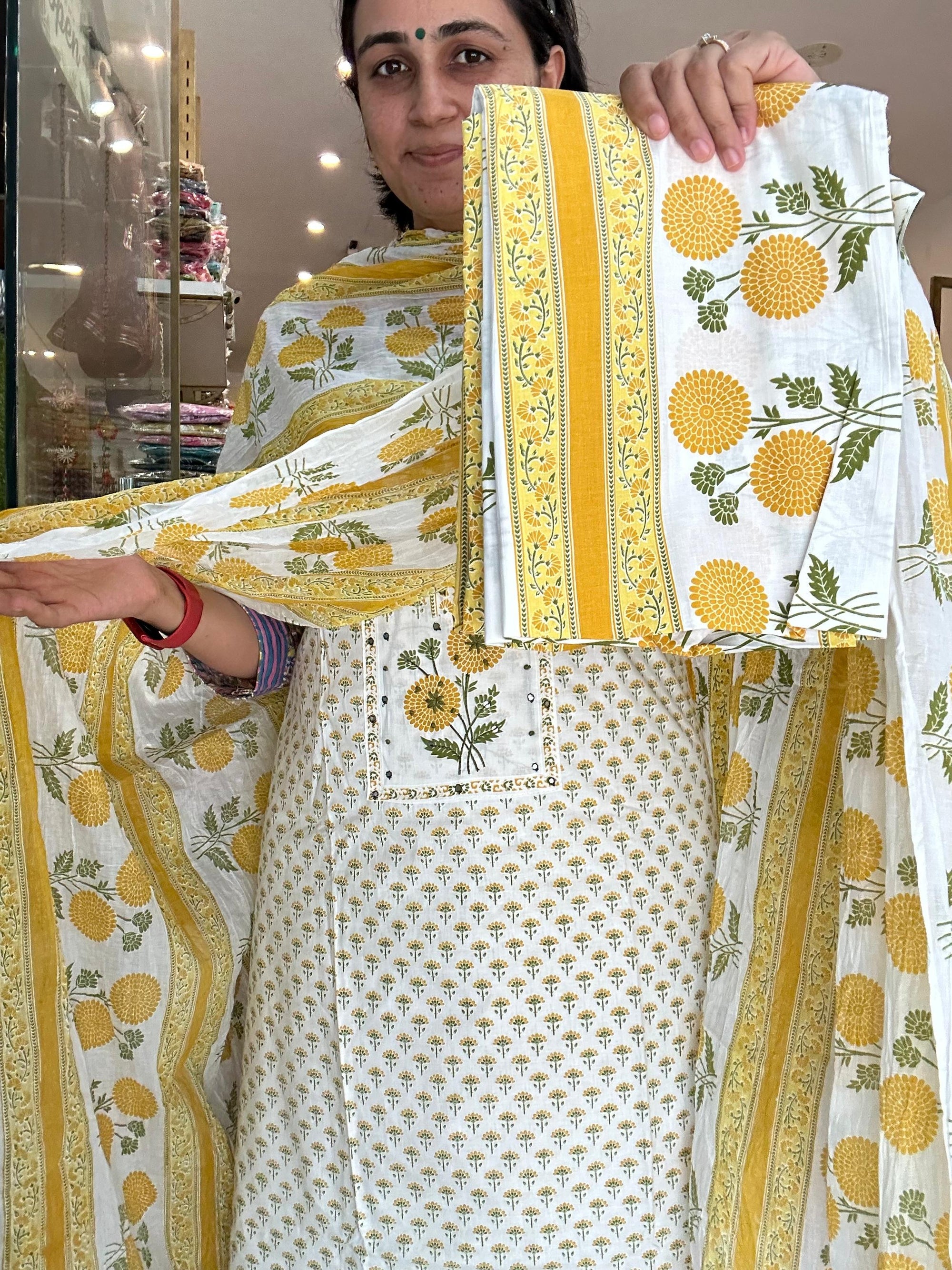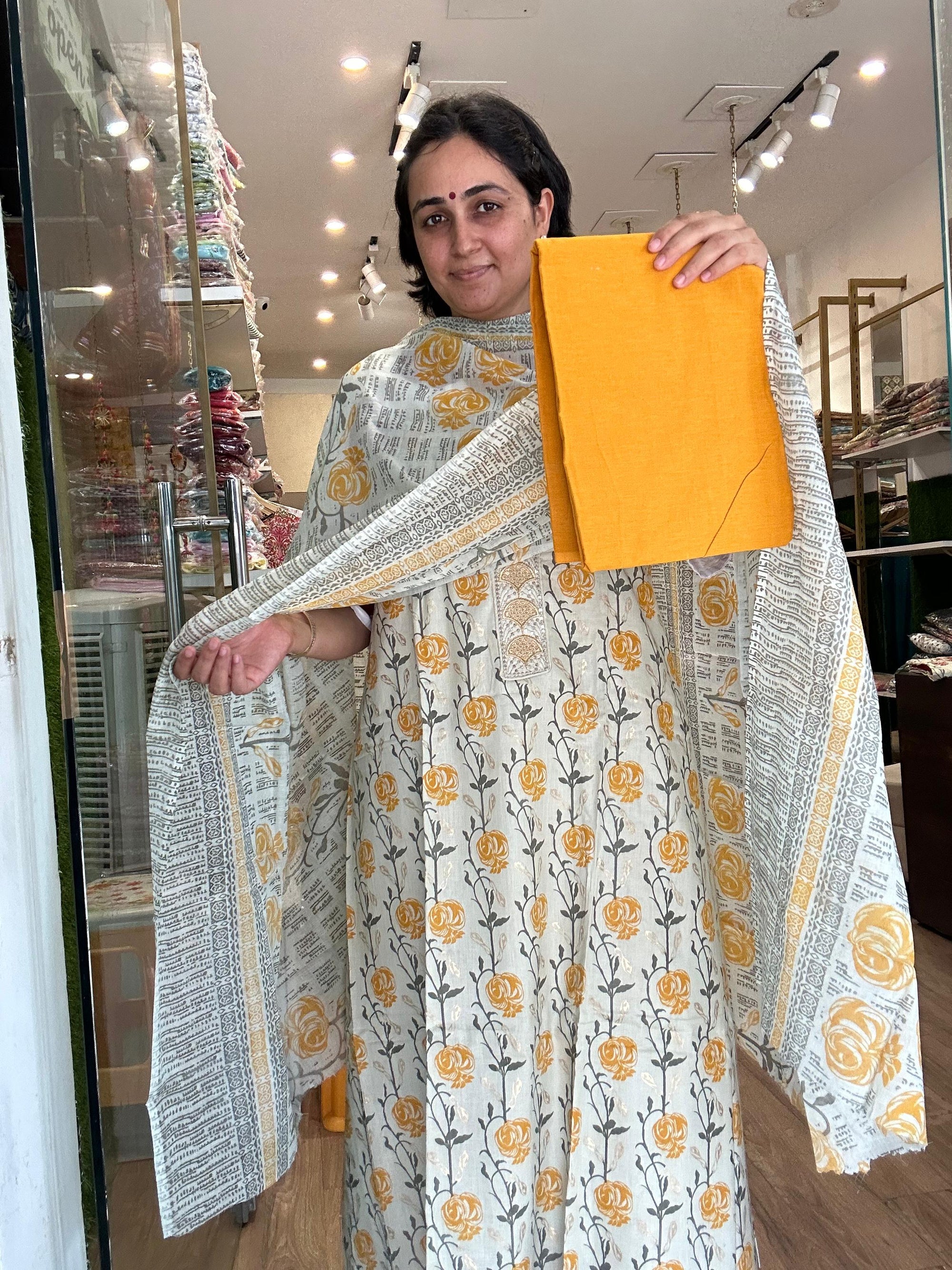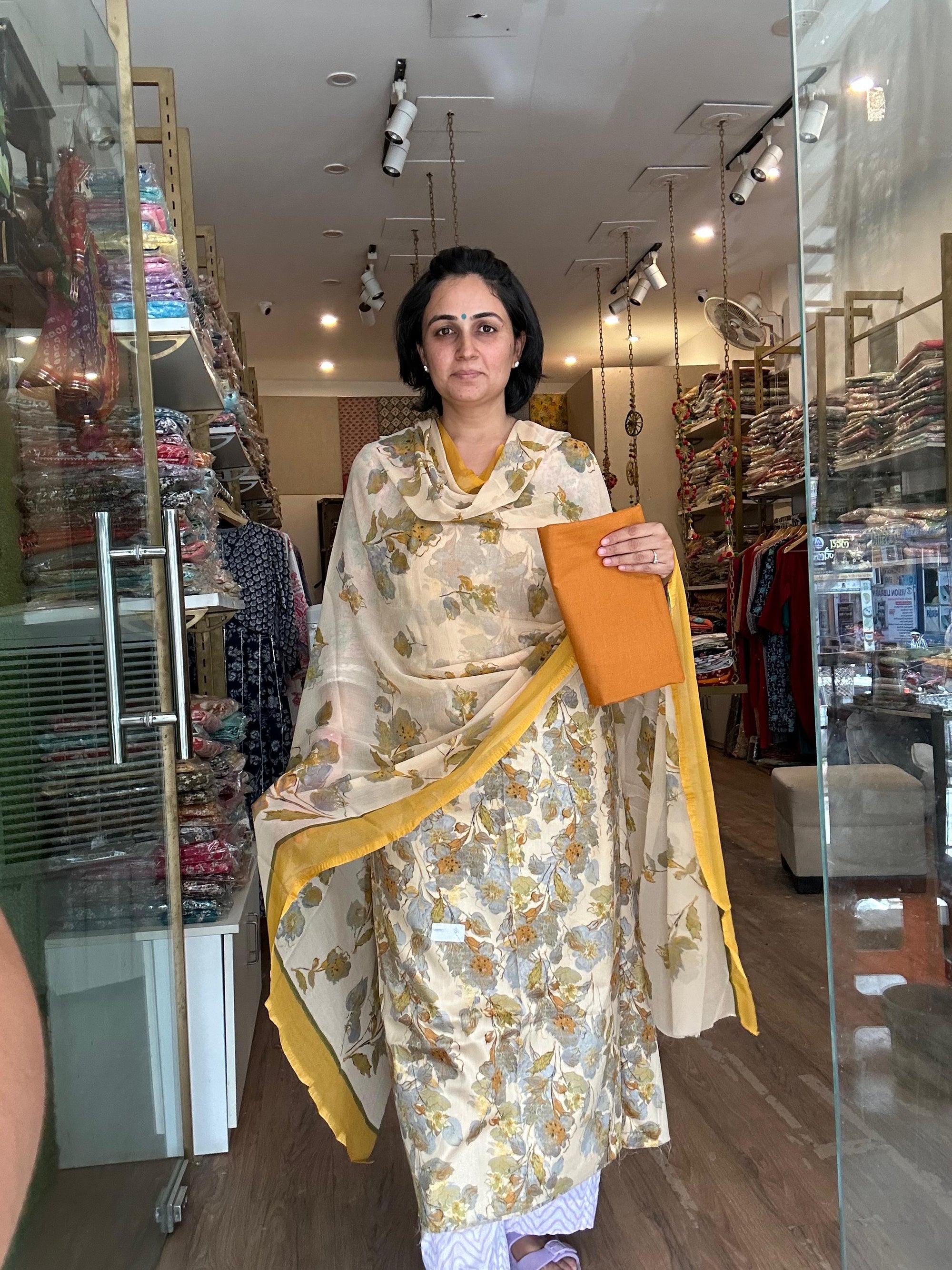 Elegant Floral Printed Cream Cotton Suit Set with Mustard Dupatta