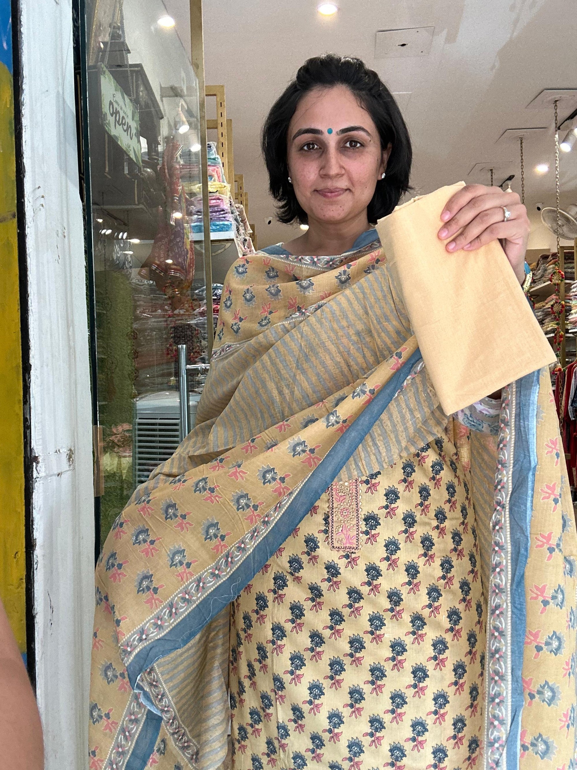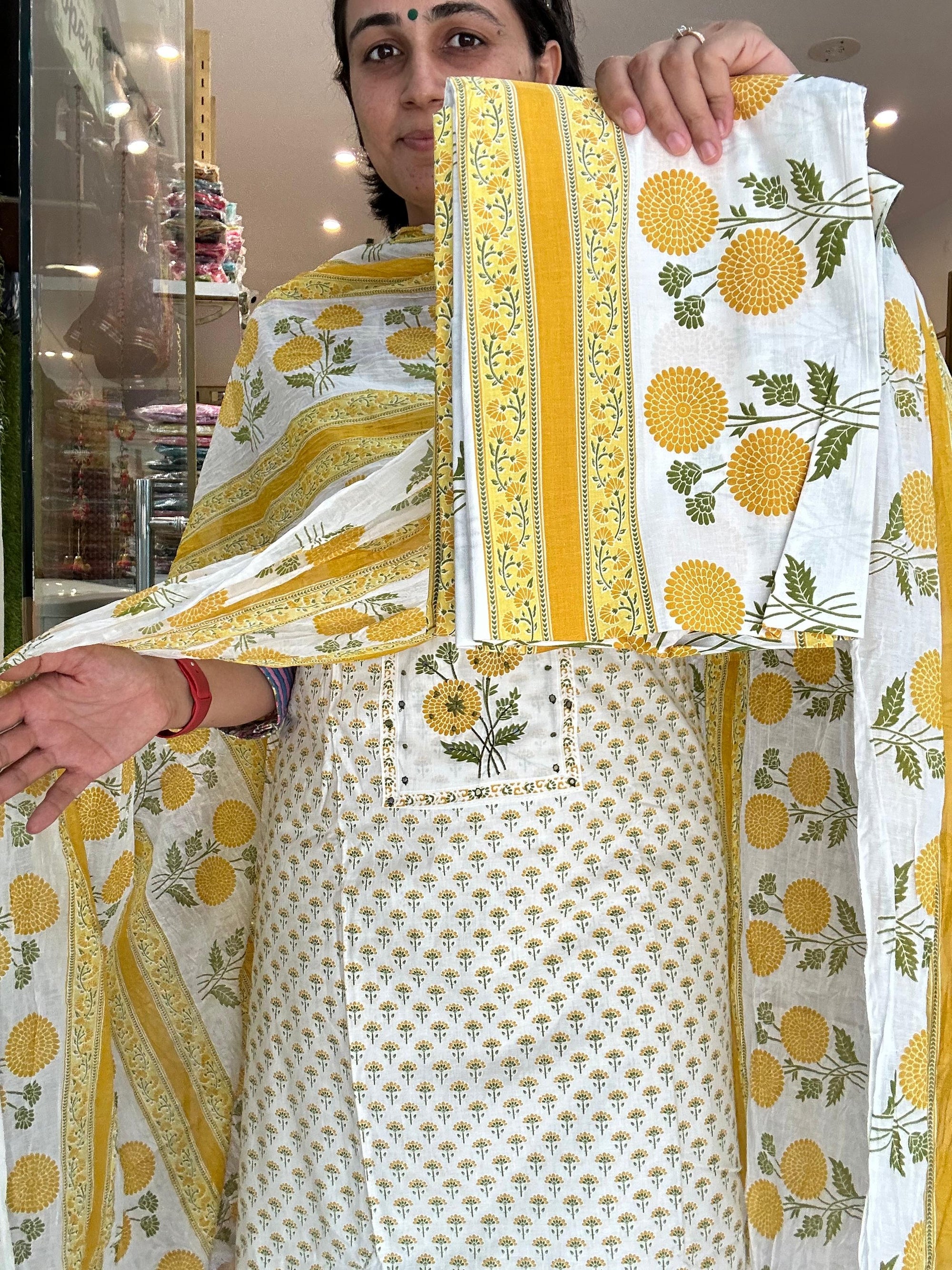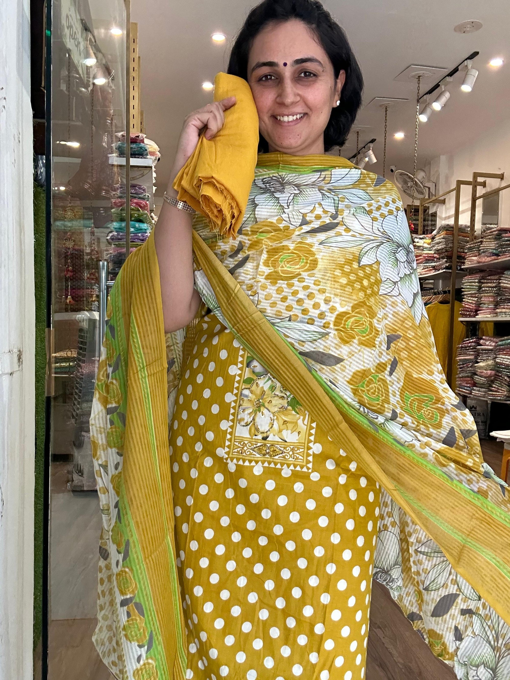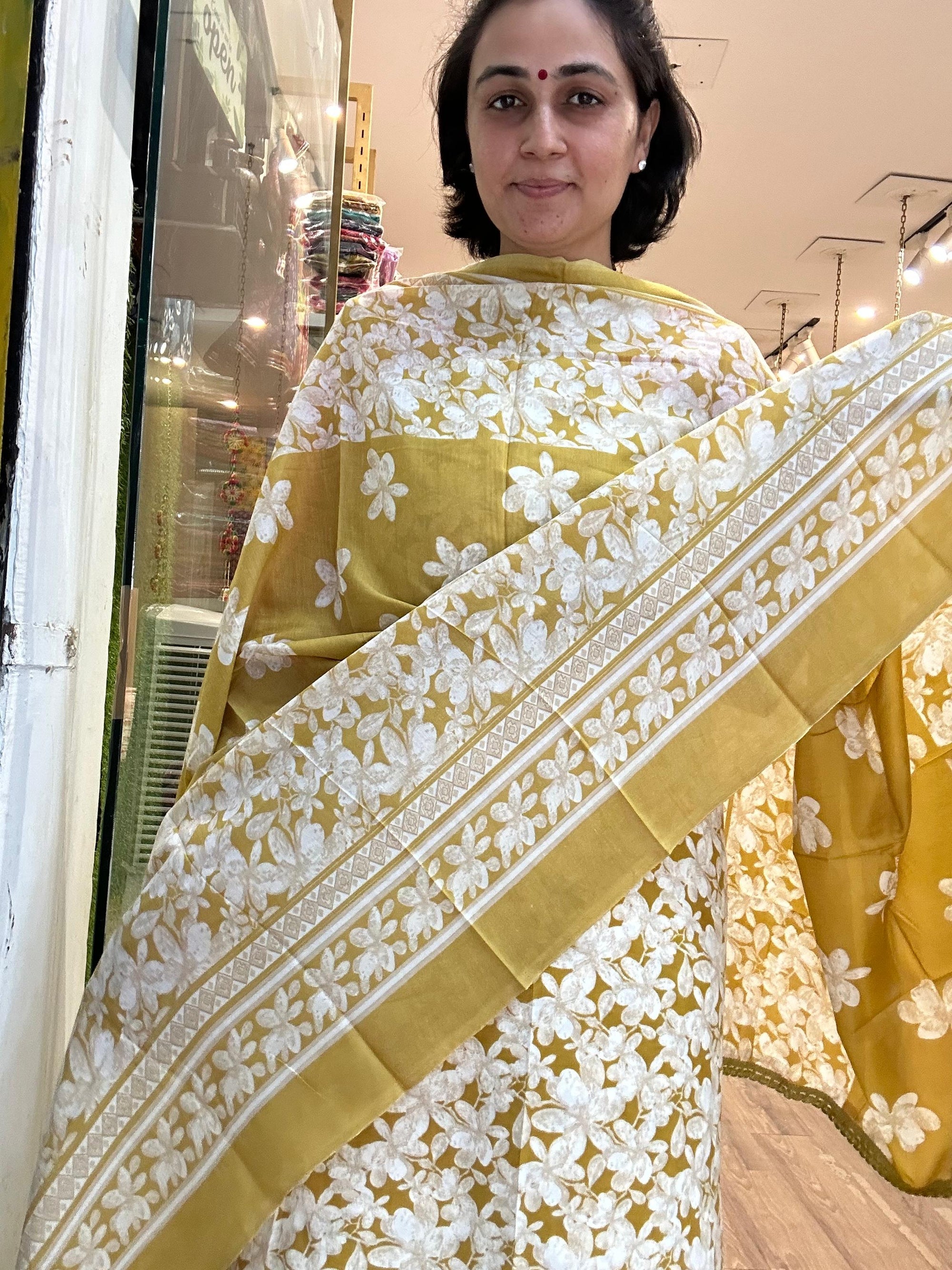 Elegant Floral Printed Cream Cotton Suit Set with Mustard Dupatta