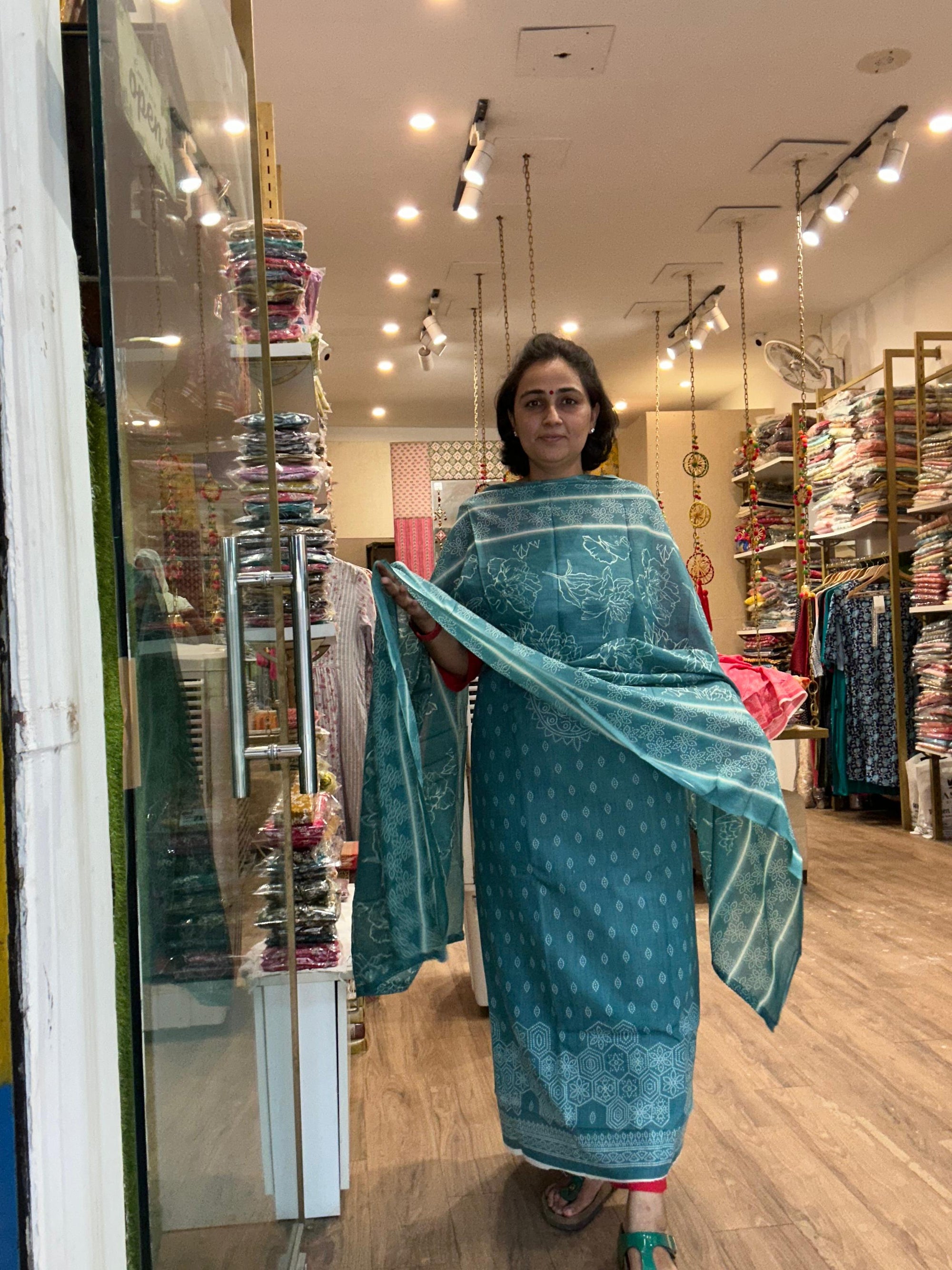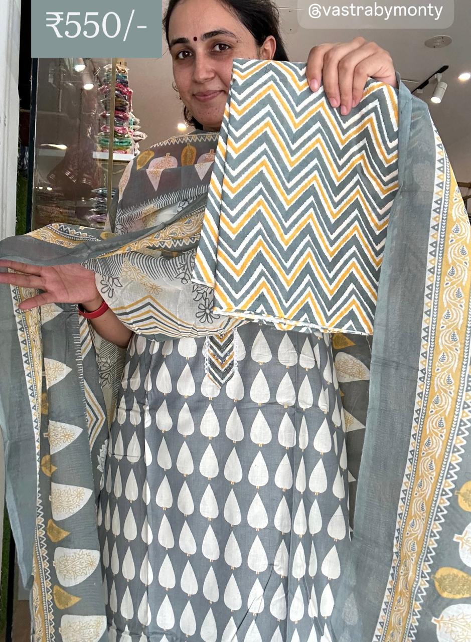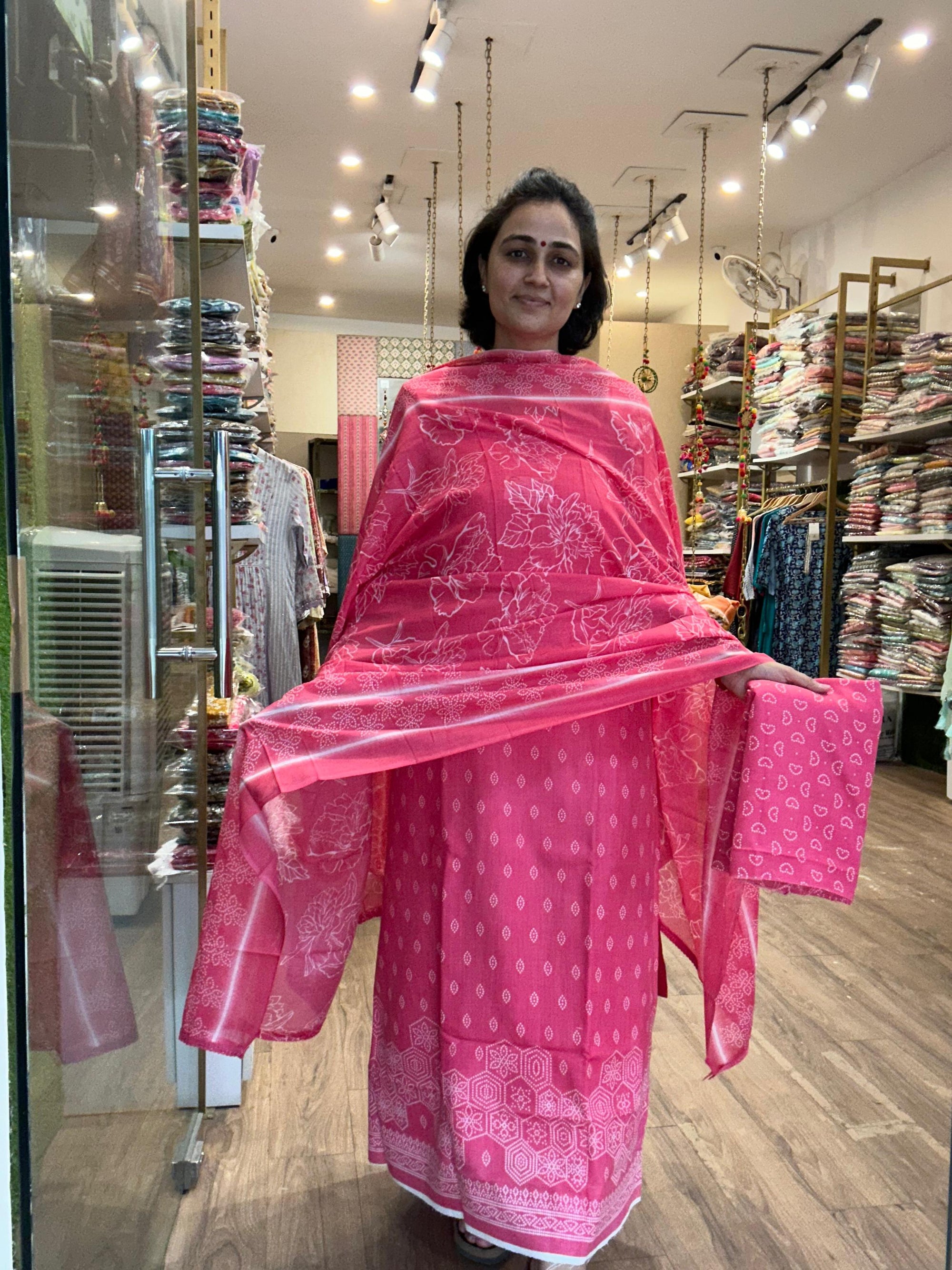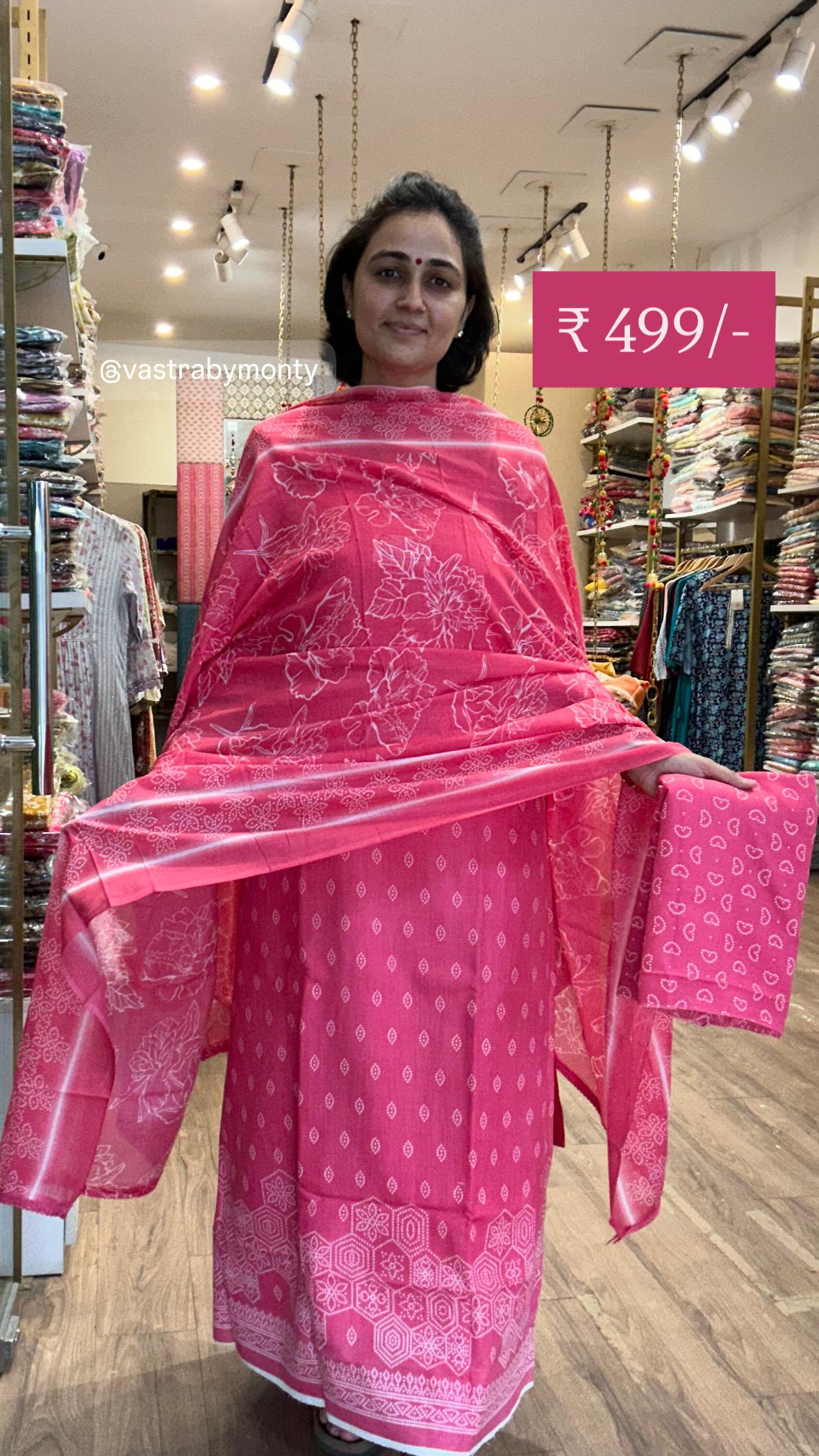Vastrabymonty Traditional Block Print Pure Cotton Unstitched 3-Piece Suit Set with Embroidered Dupatta – Pink, Yellow, Turquoise, Light Blue – Rs. 450 Only