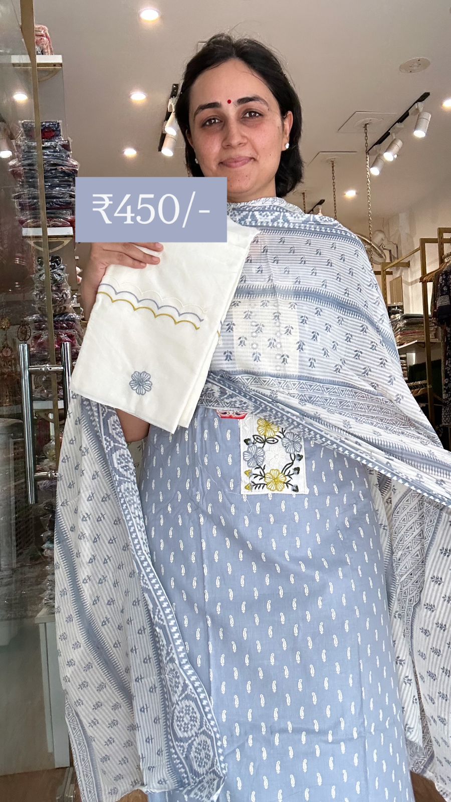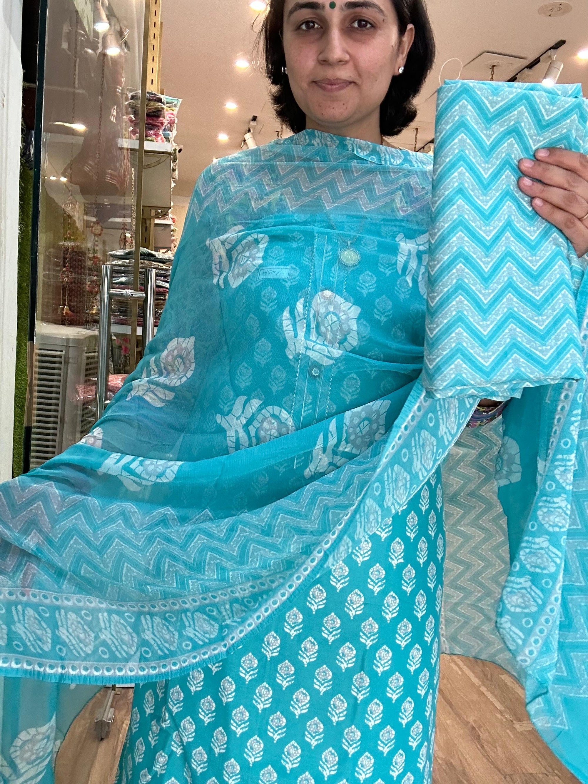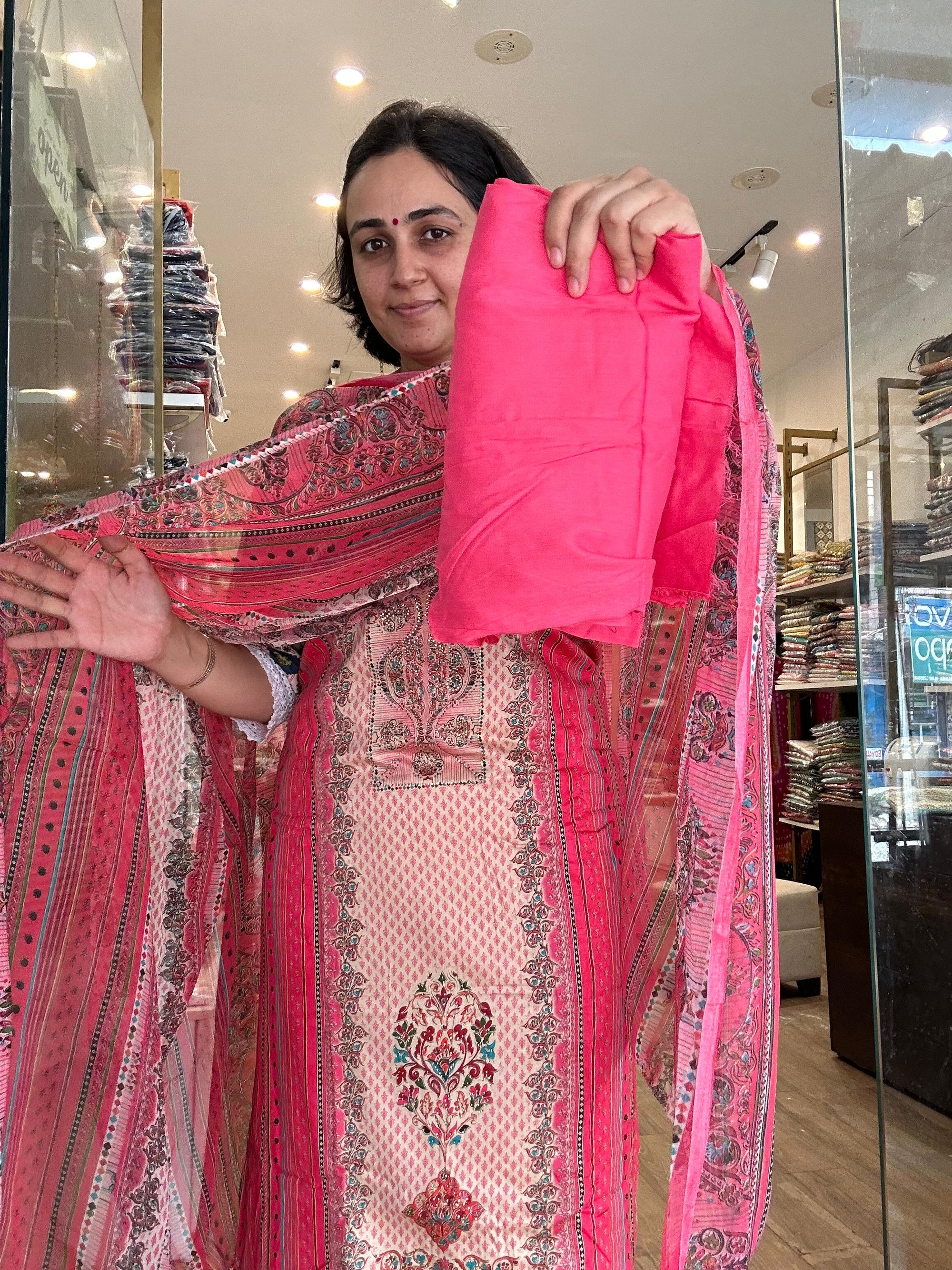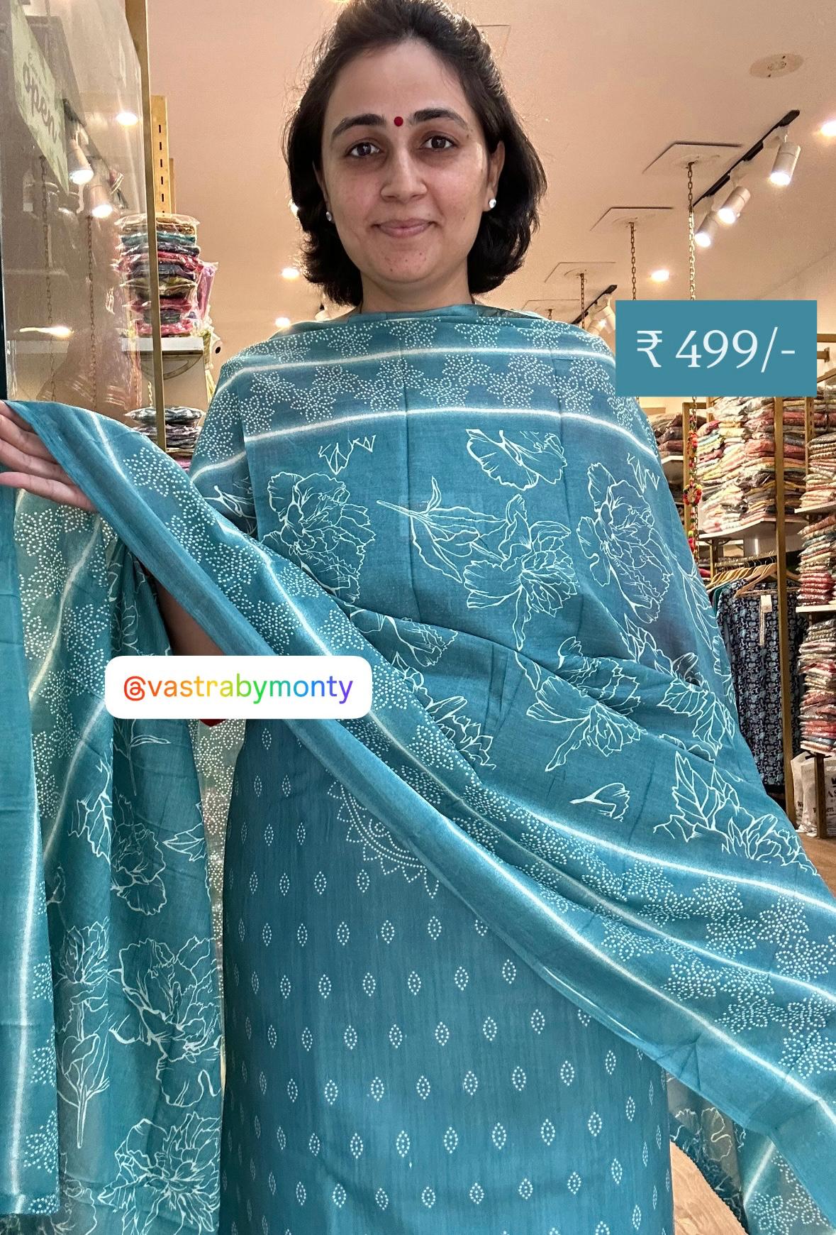 Vastrabymonty Traditional Block Print Pure Cotton Unstitched 3-Piece Suit Set with Embroidered Dupatta – Pink, Yellow, Turquoise, Light Blue – Rs. 450 Only