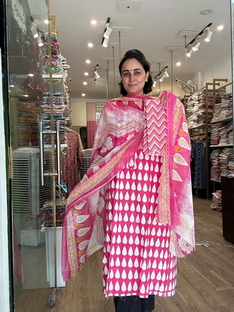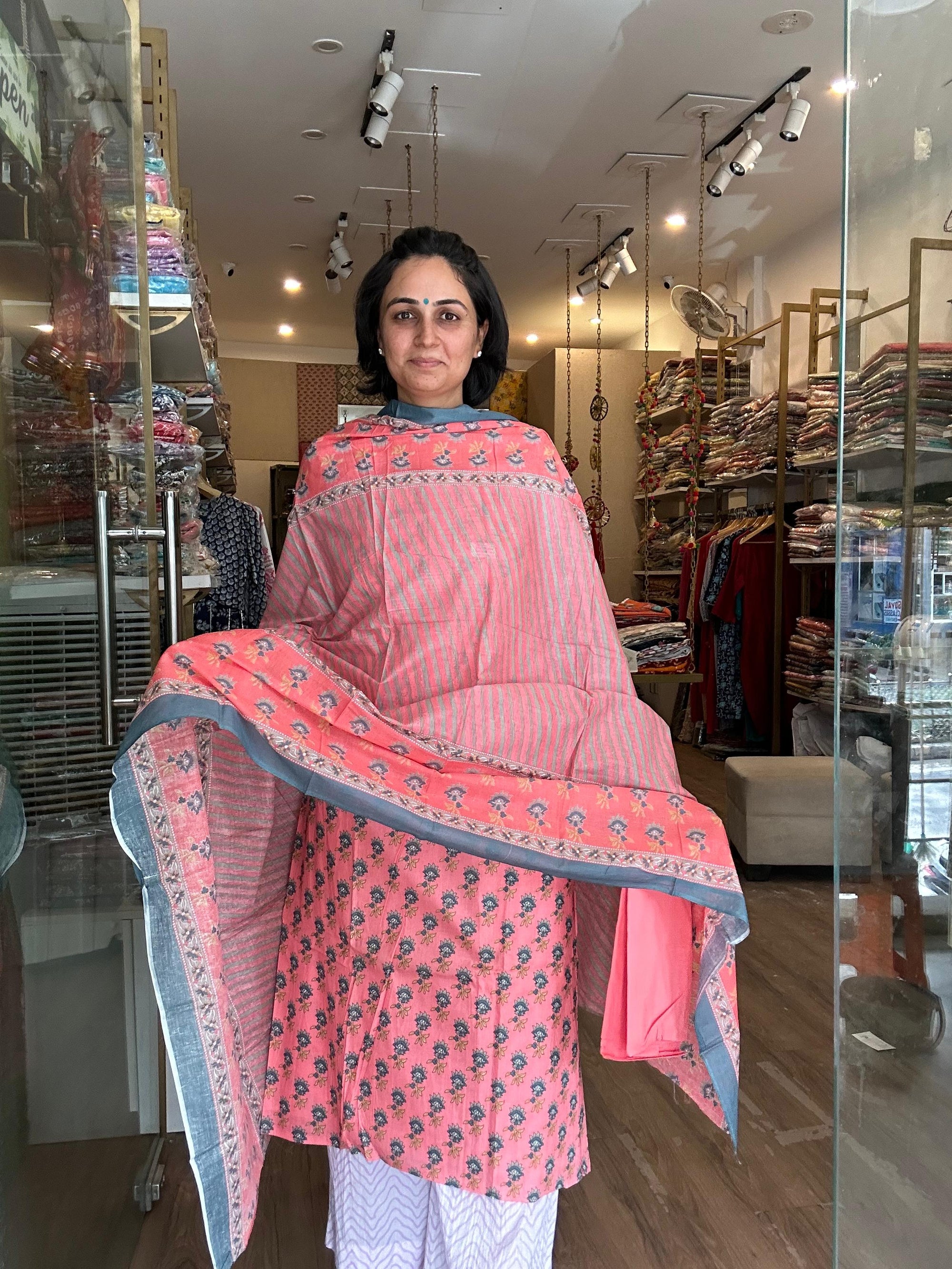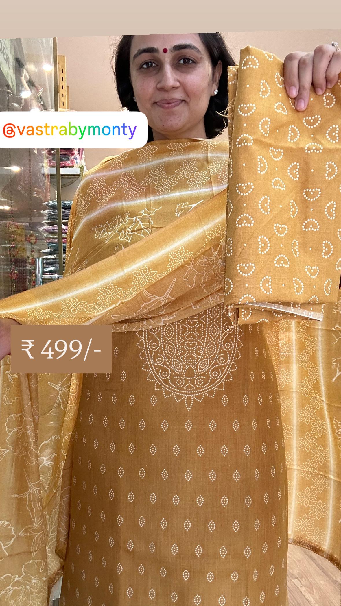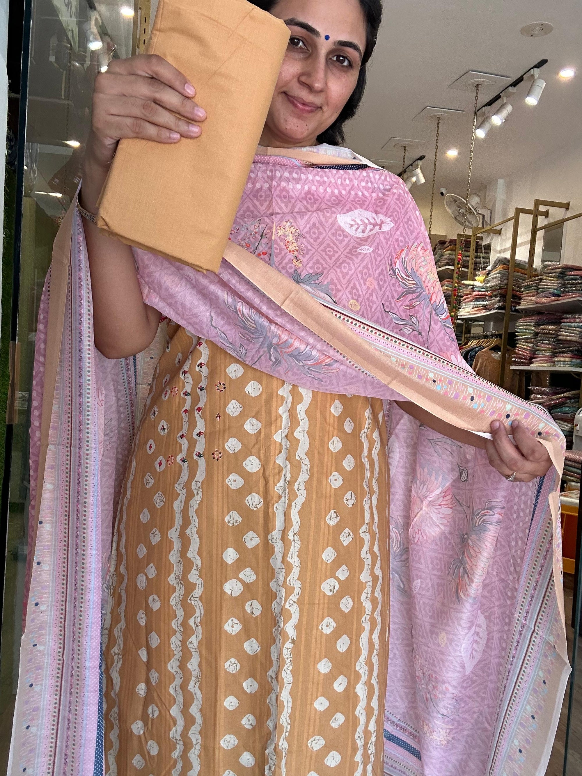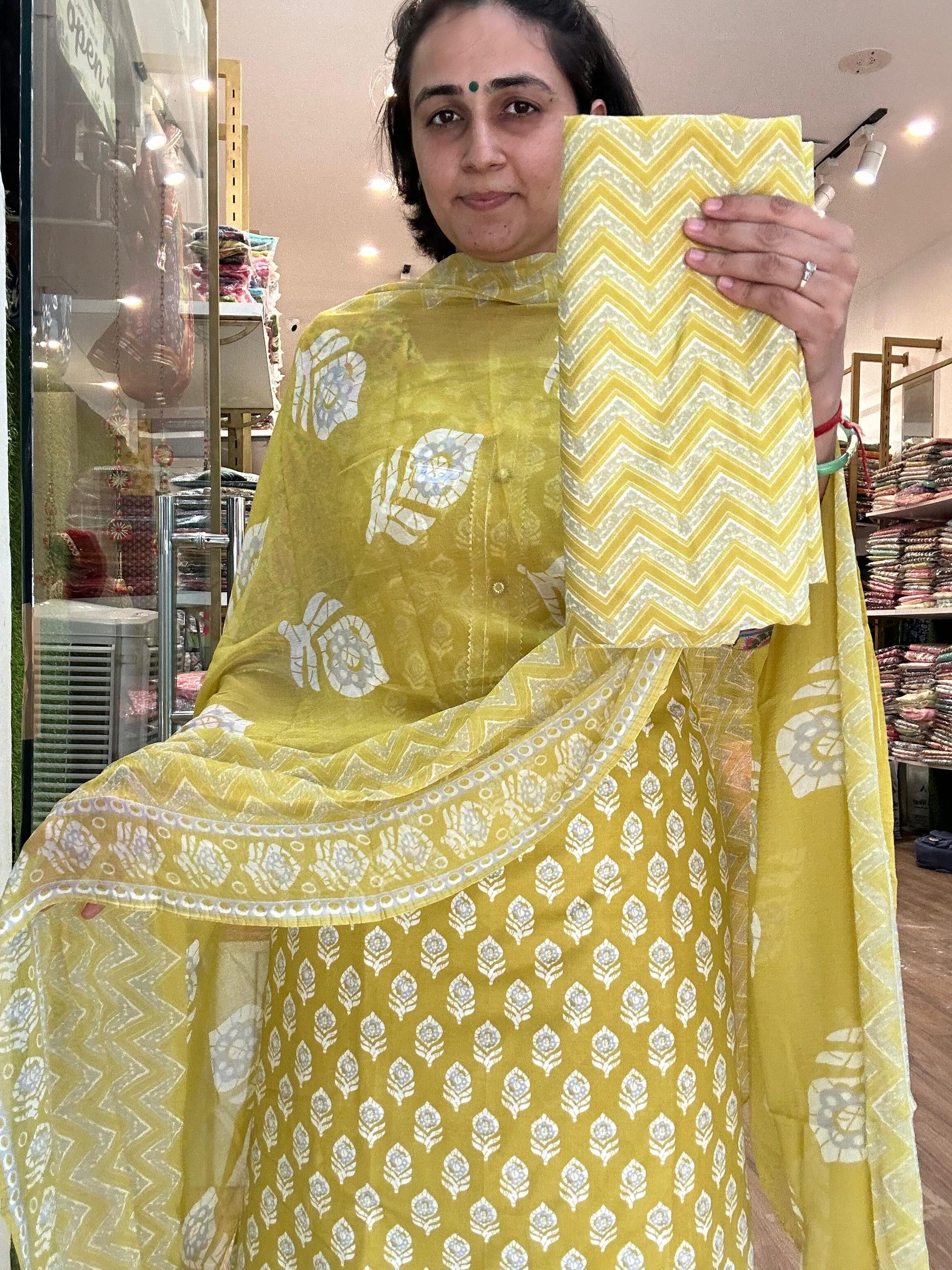 Vastrabymonty Traditional Block Print Pure Cotton Unstitched 3-Piece Suit Set with Embroidered Dupatta – Pink, Yellow, Turquoise, Light Blue – Rs. 450 Only