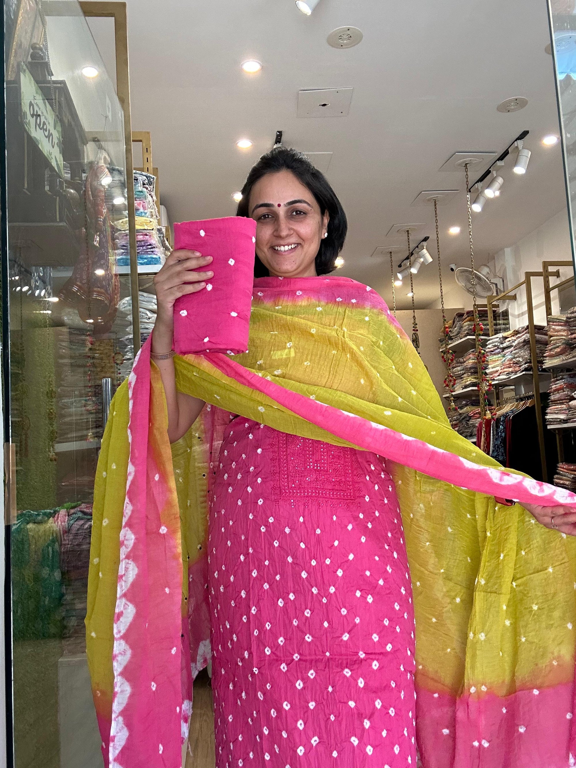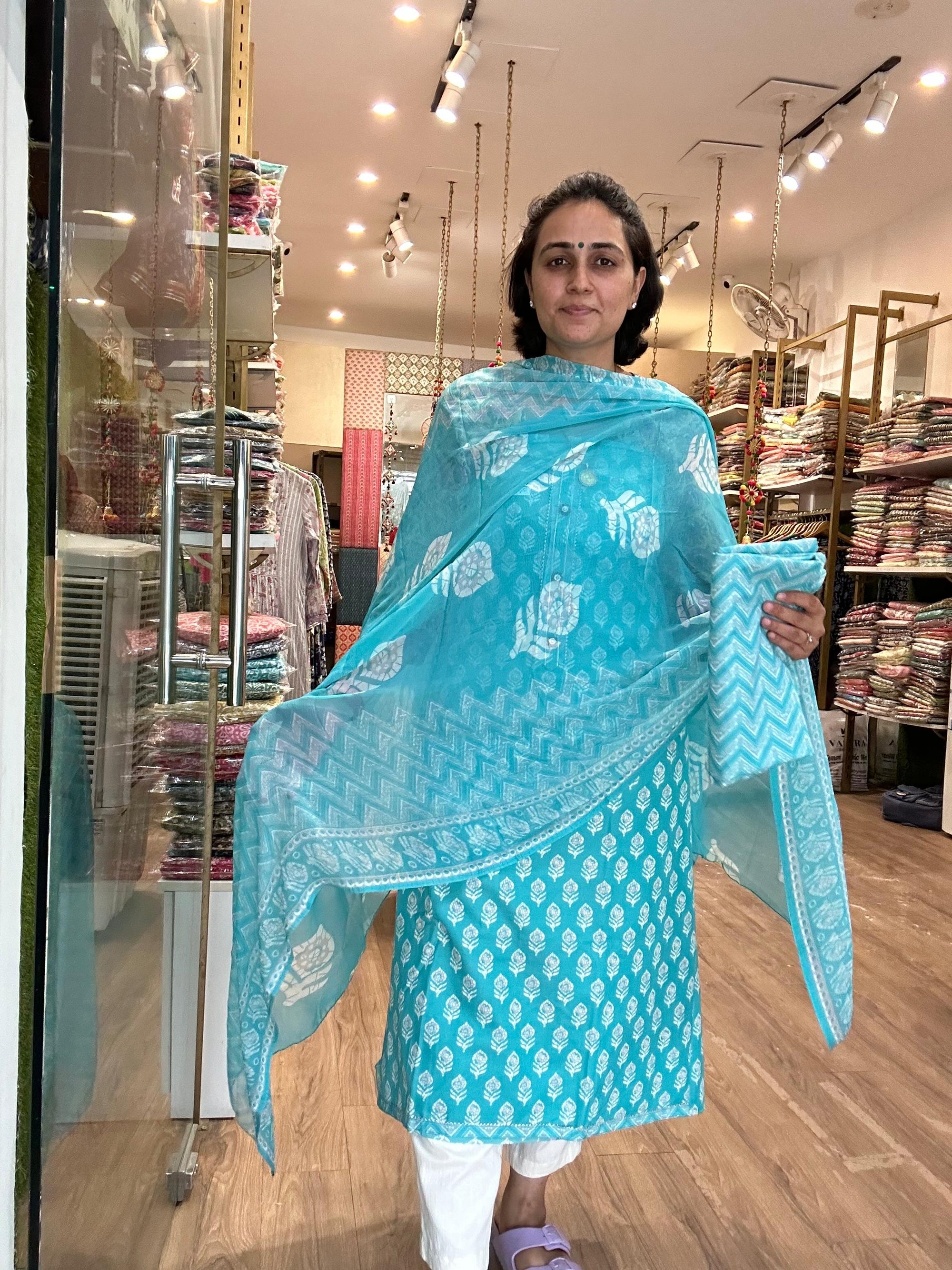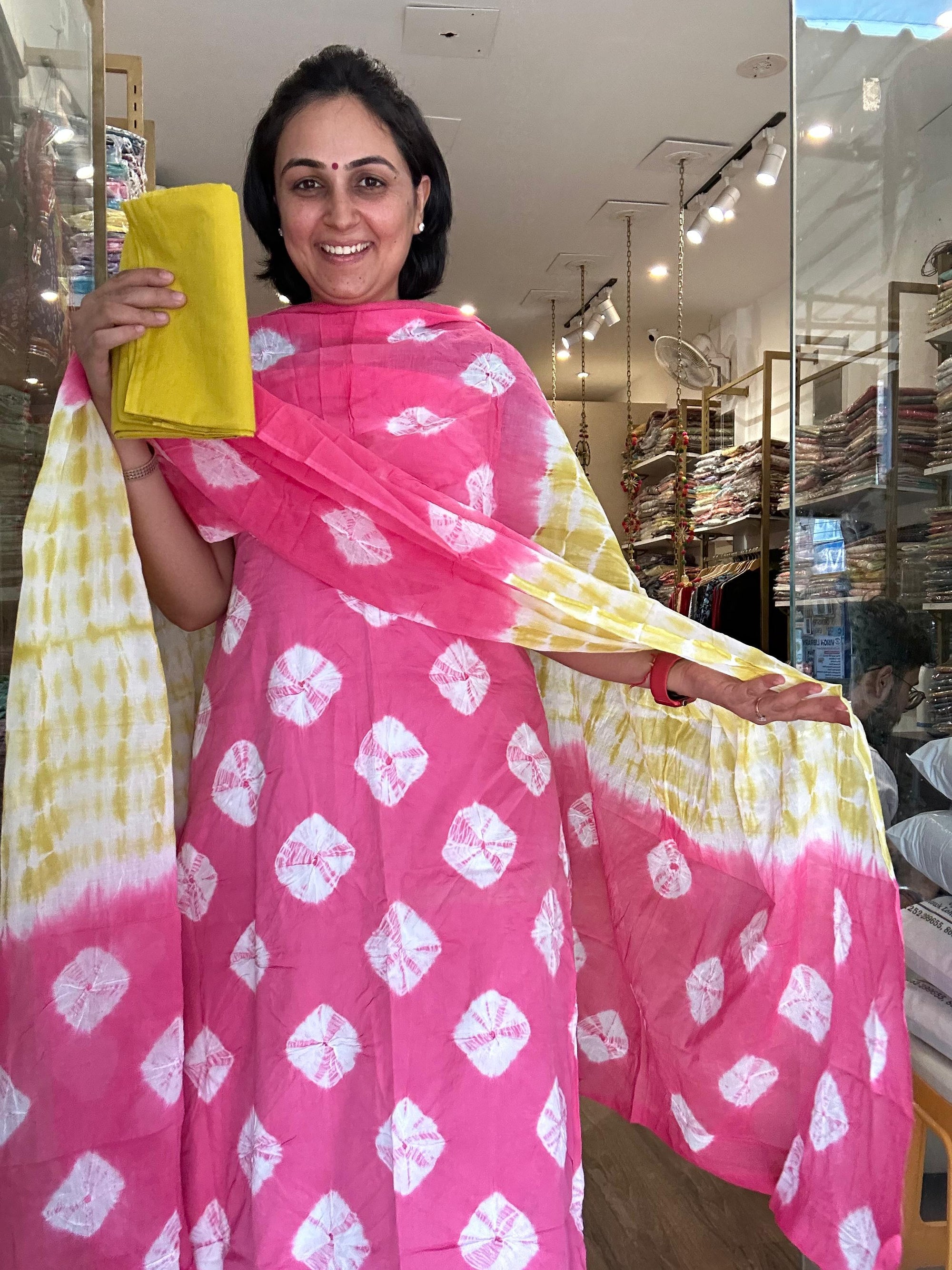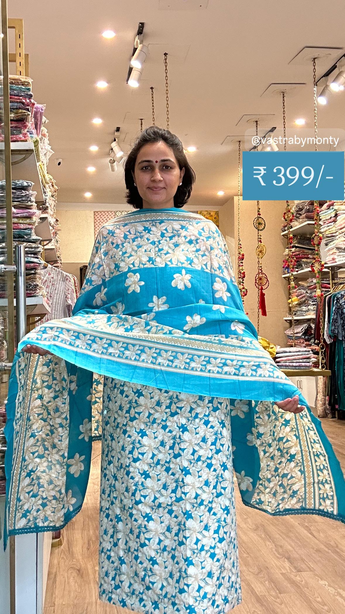 Vastrabymonty Traditional Block Print Pure Cotton Unstitched 3-Piece Suit Set with Embroidered Dupatta – Pink, Yellow, Turquoise, Light Blue – Rs. 450 Only