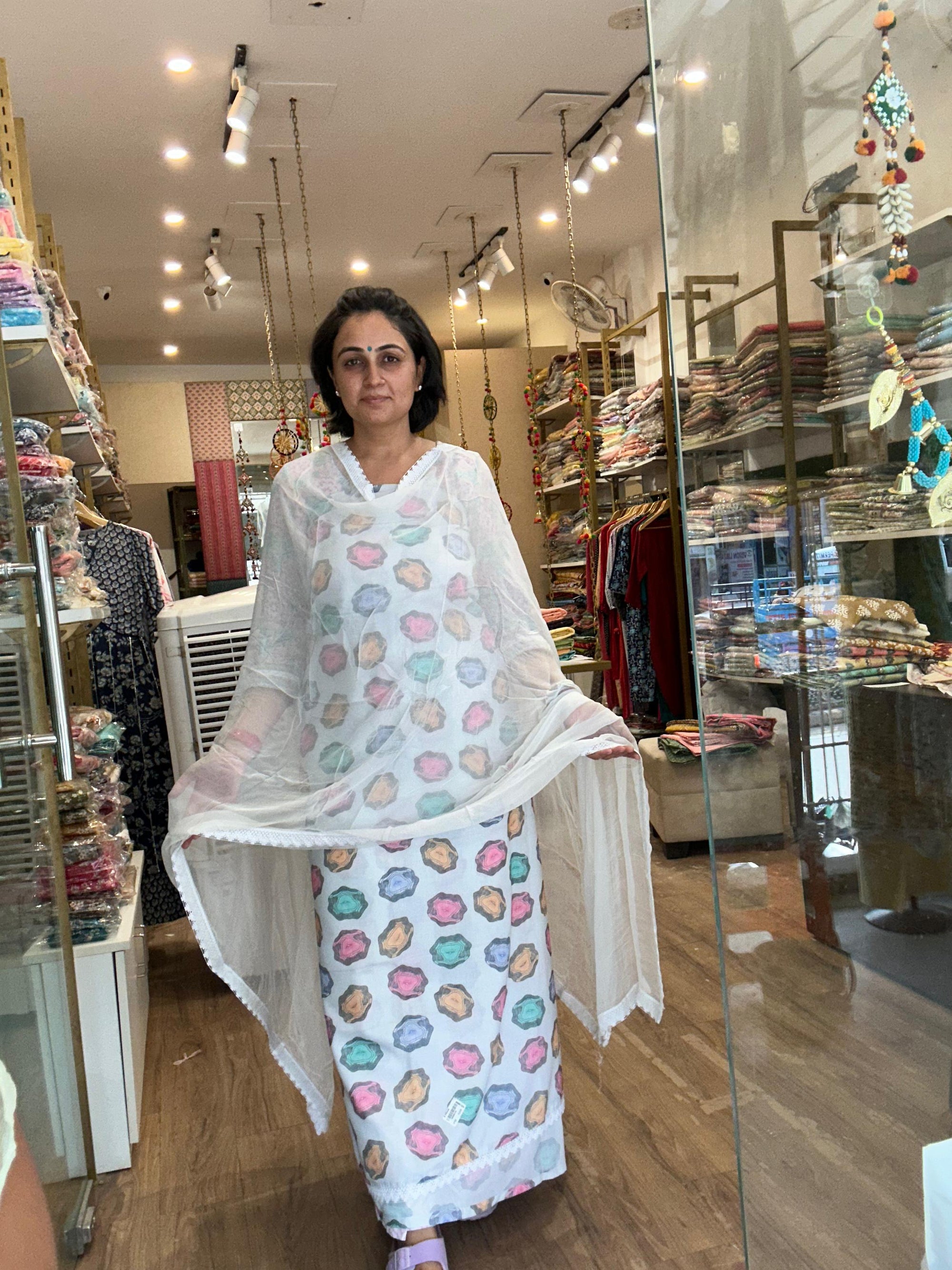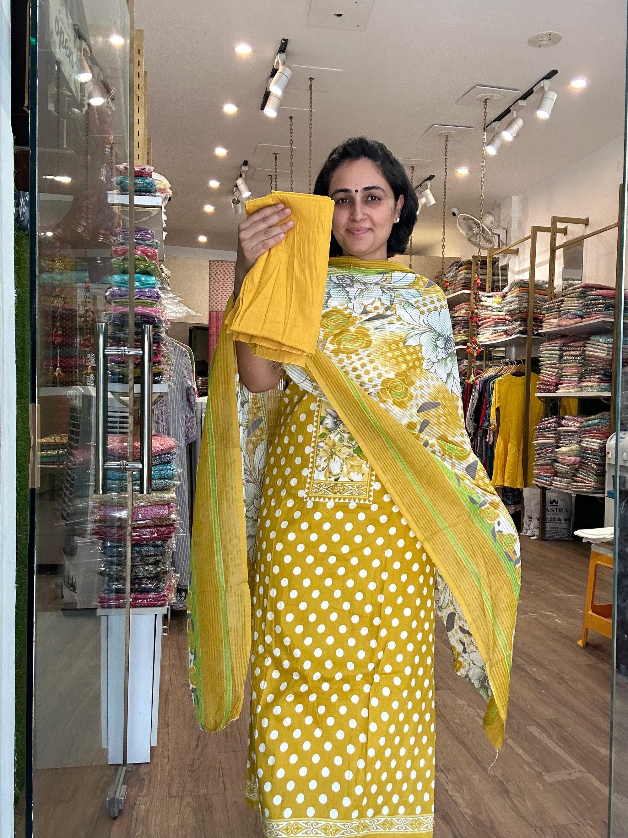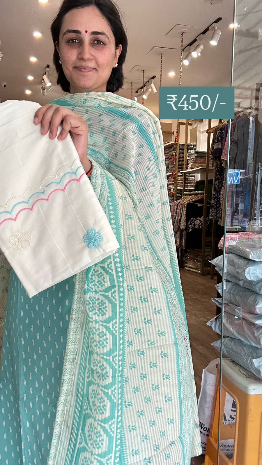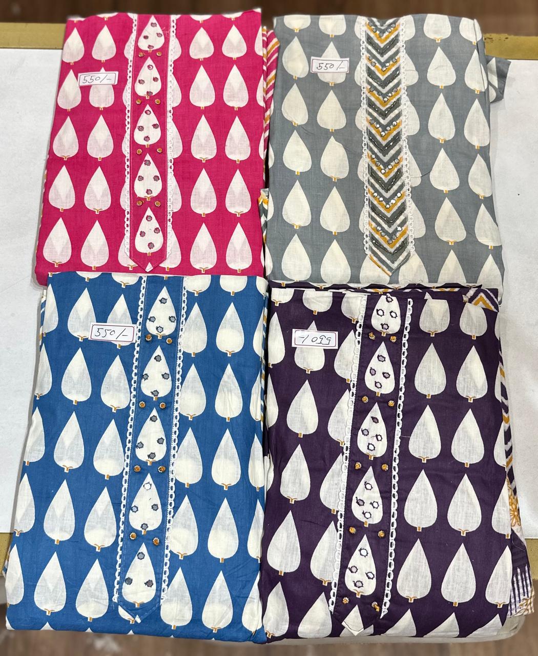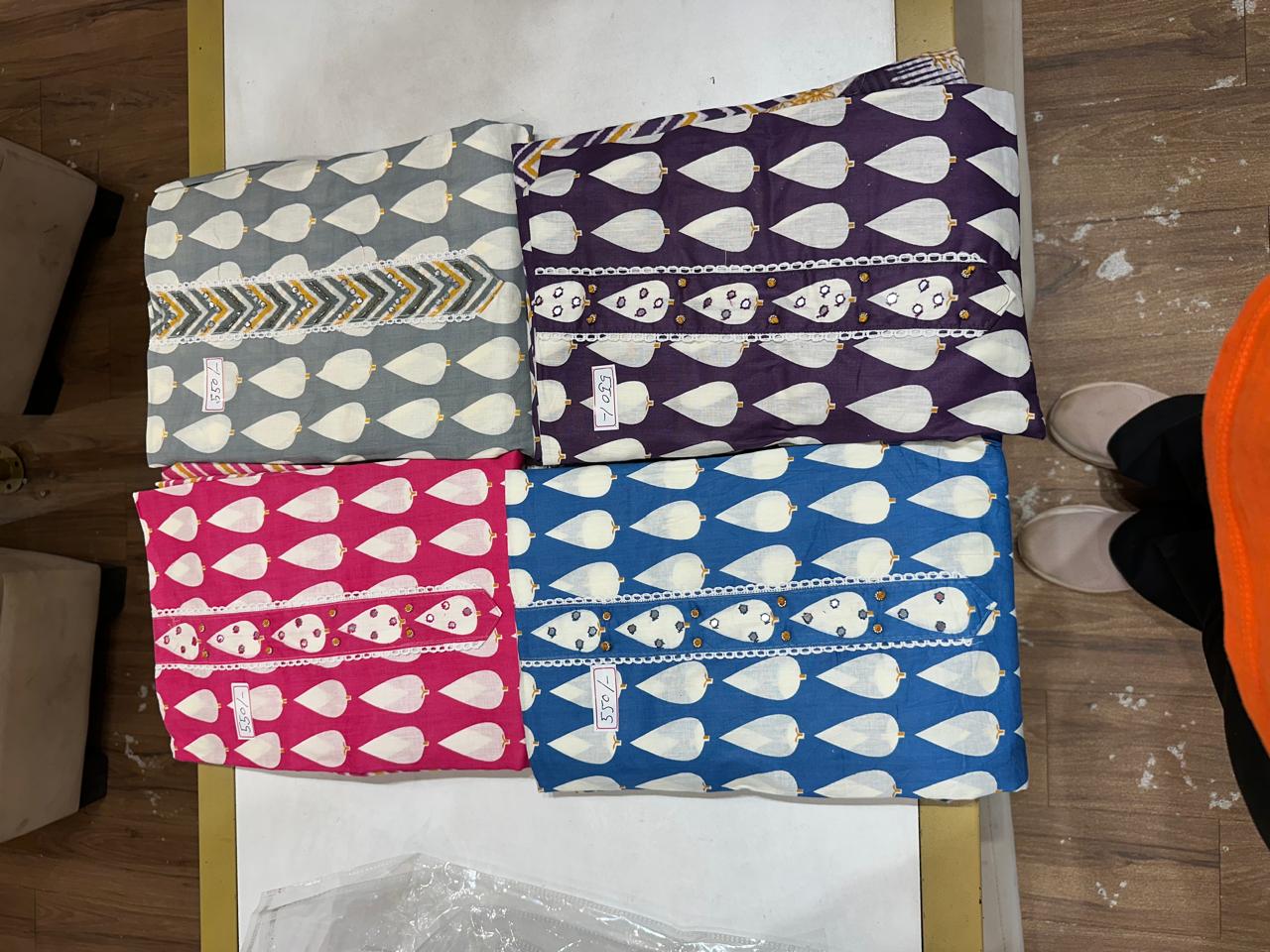 Elegant Cotton Printed Suit Set with Lace & Mirror Work – Multiple Shades