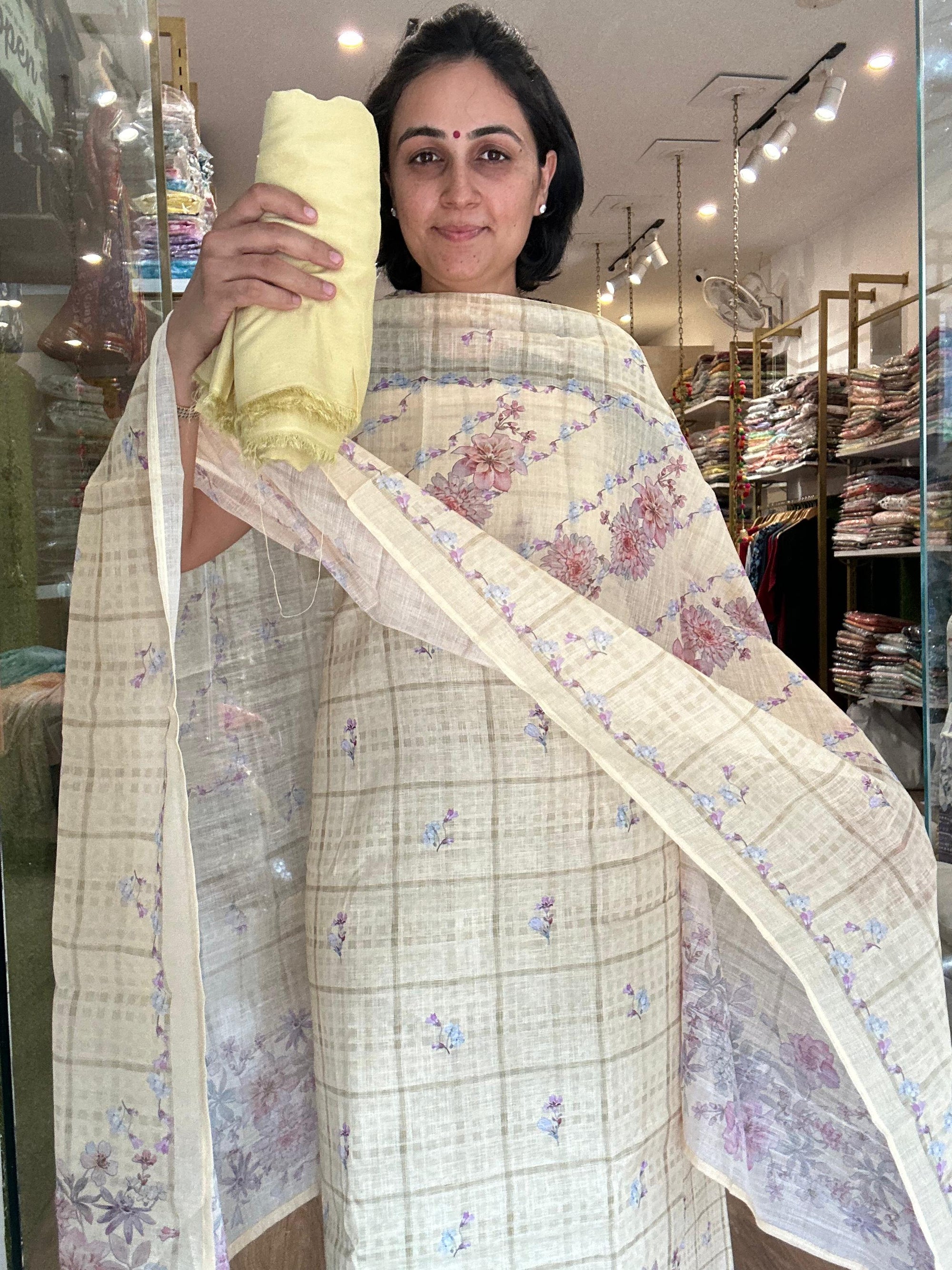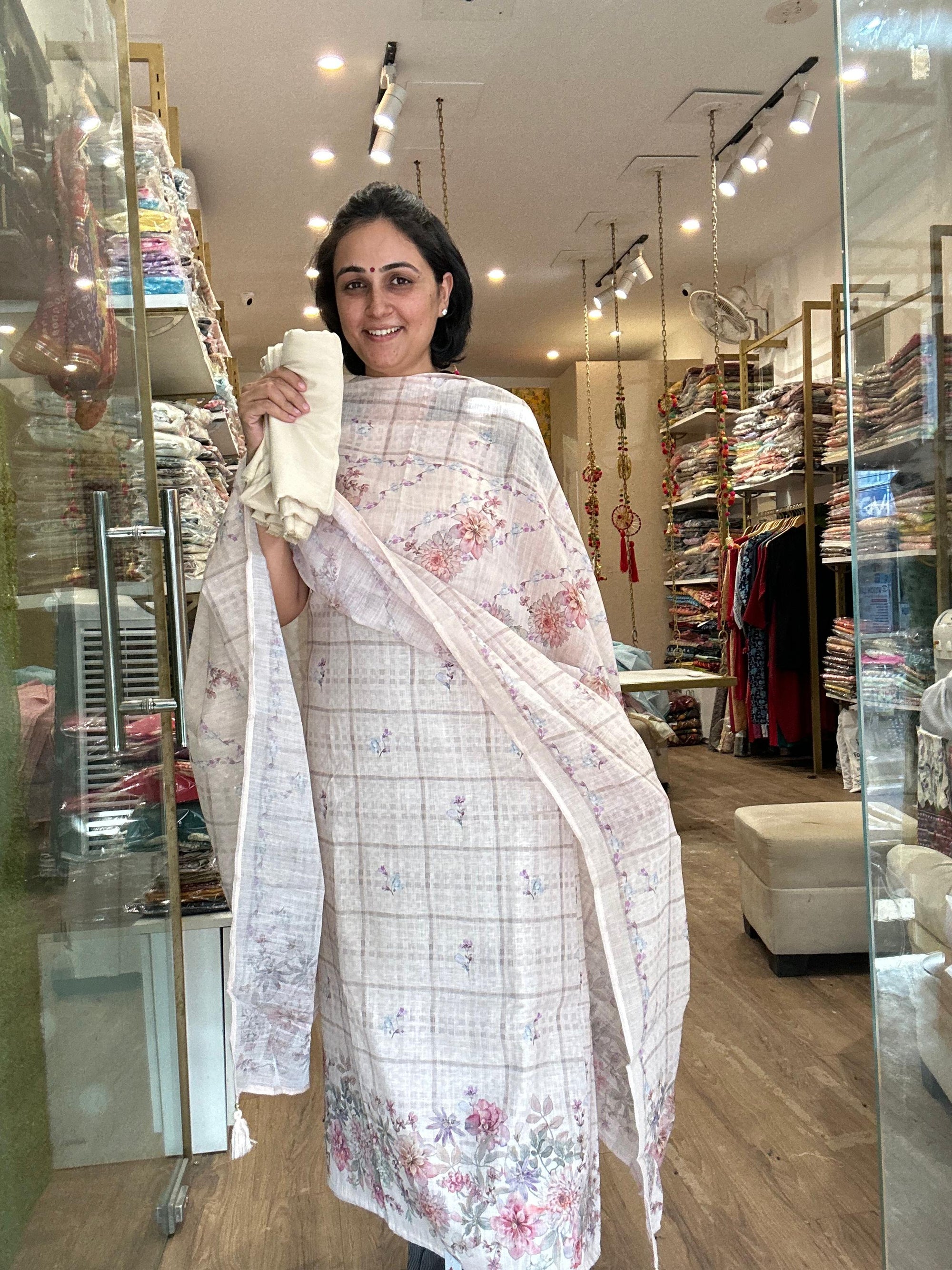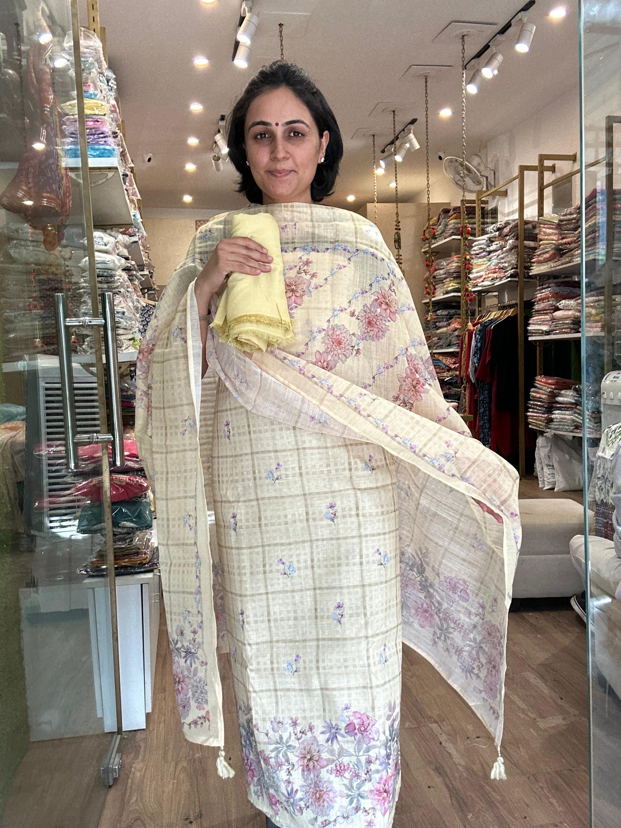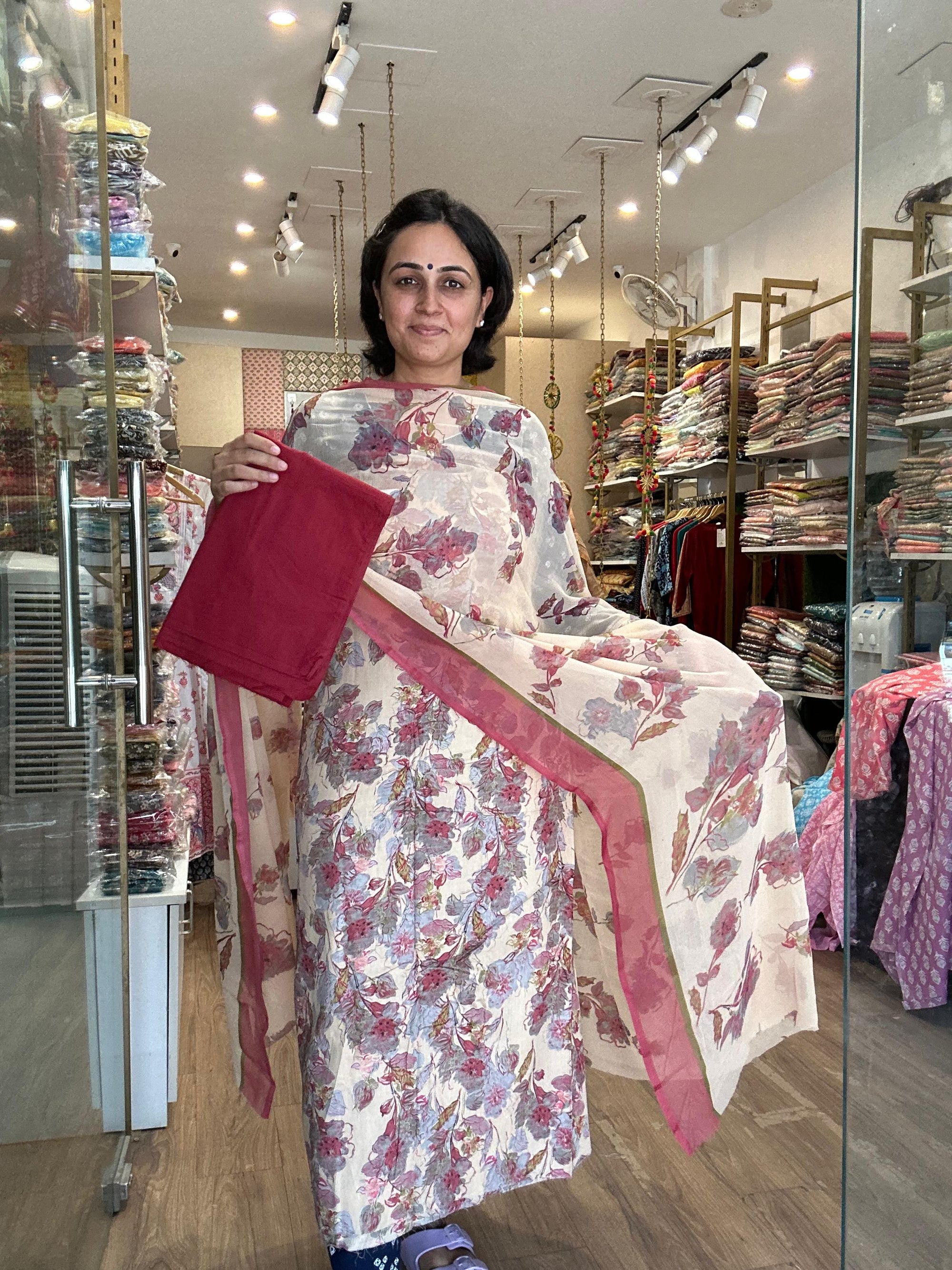 Elegant Cream Floral Printed Suit with chiffon Dupatta