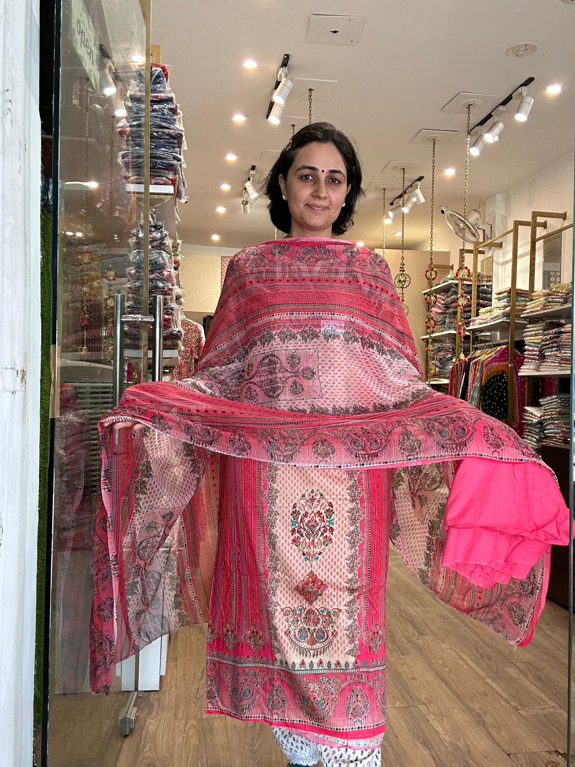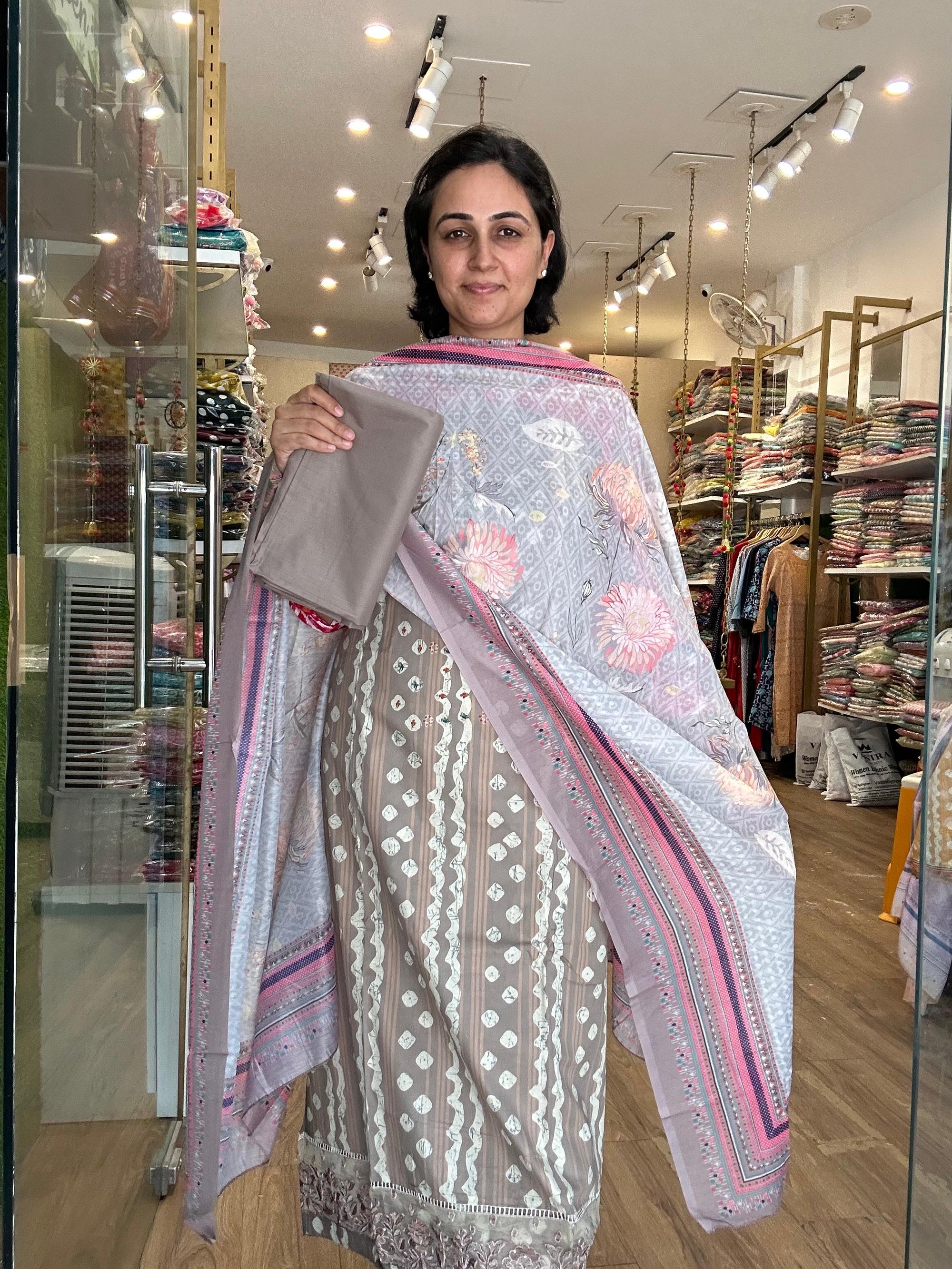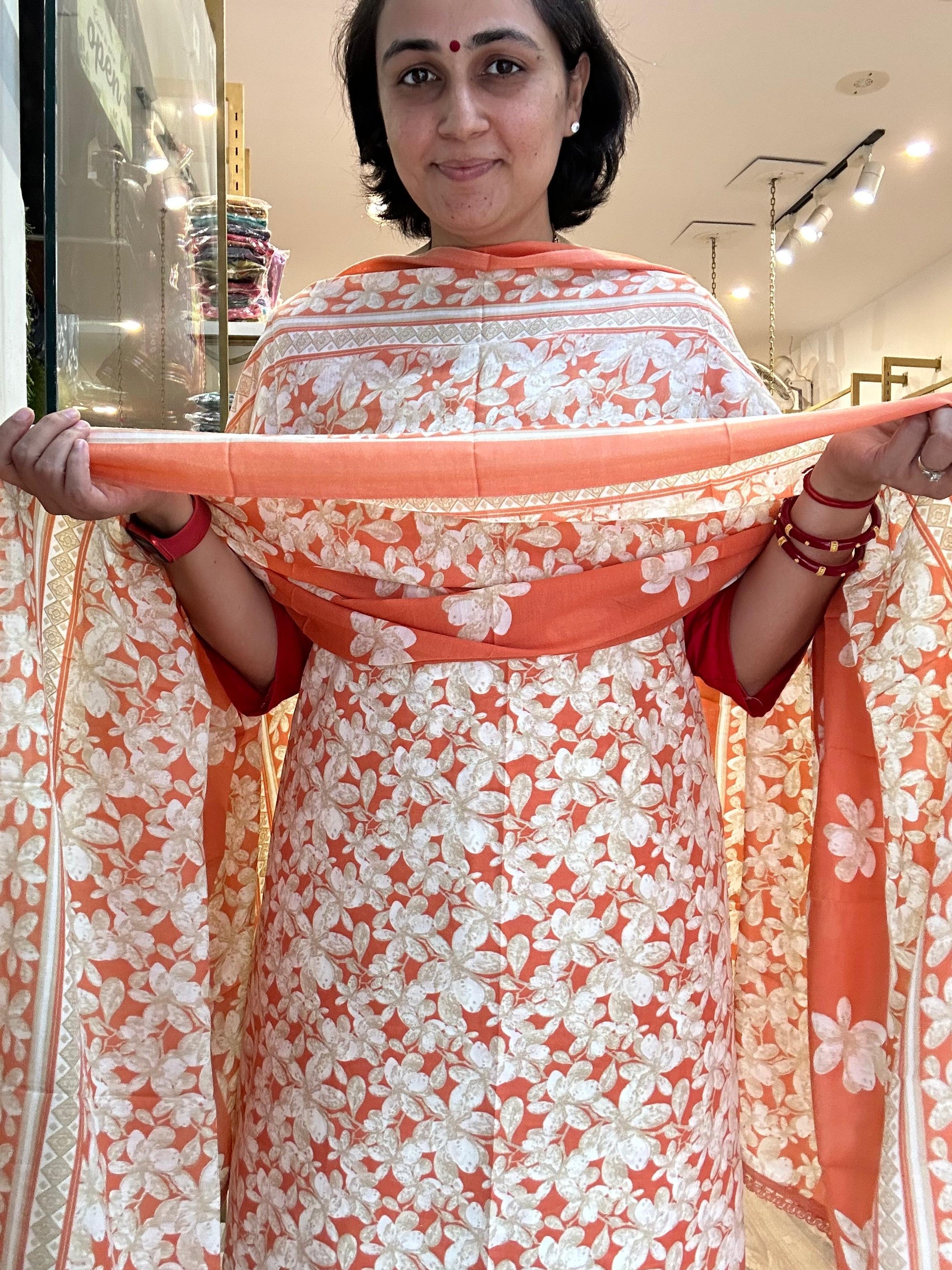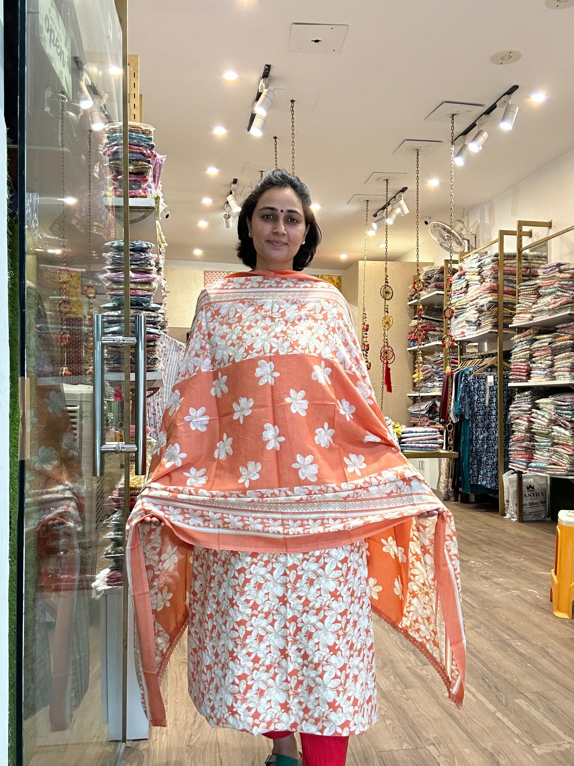 Elegant Cream Floral Printed Suit with chiffon Dupatta