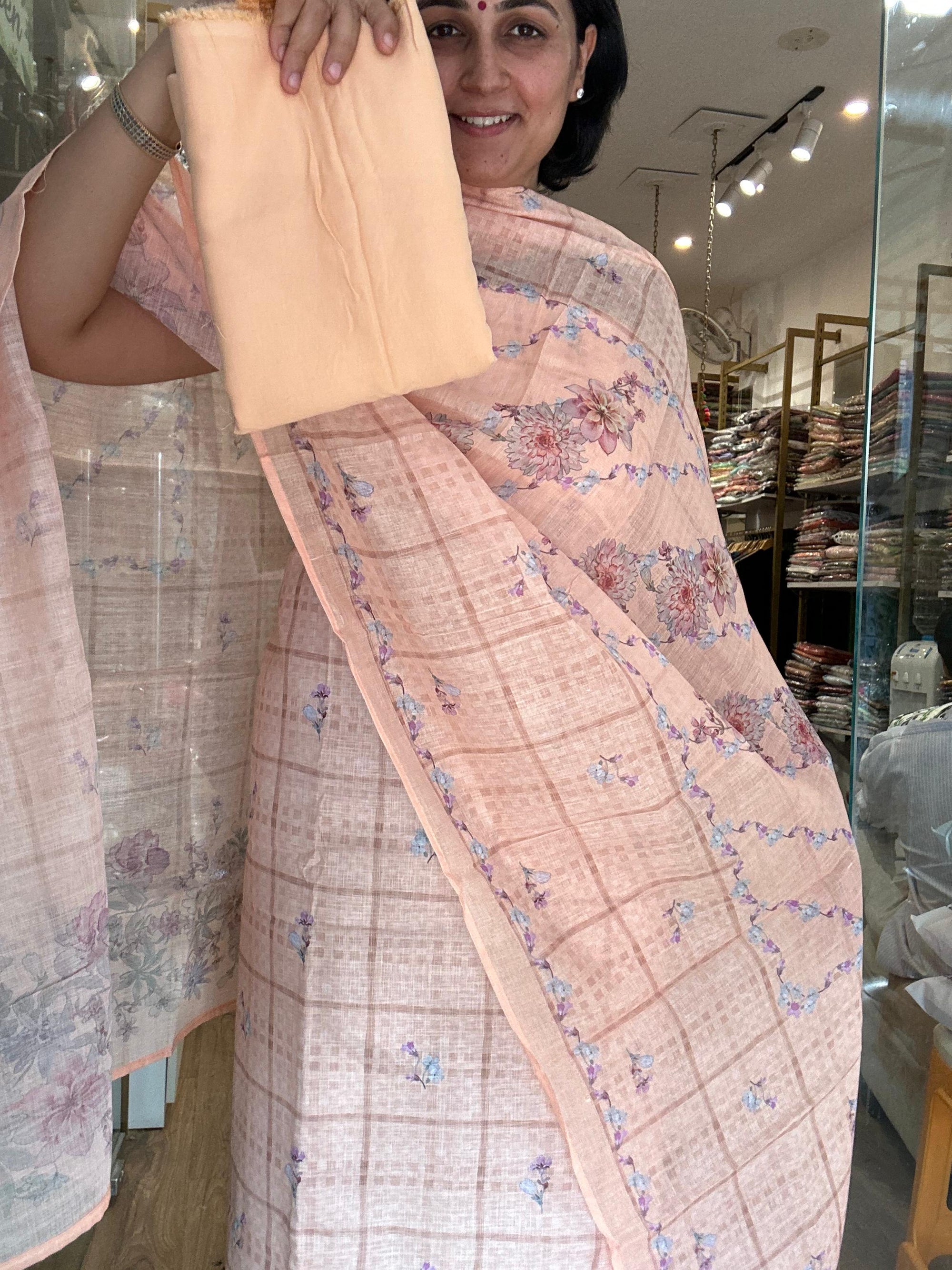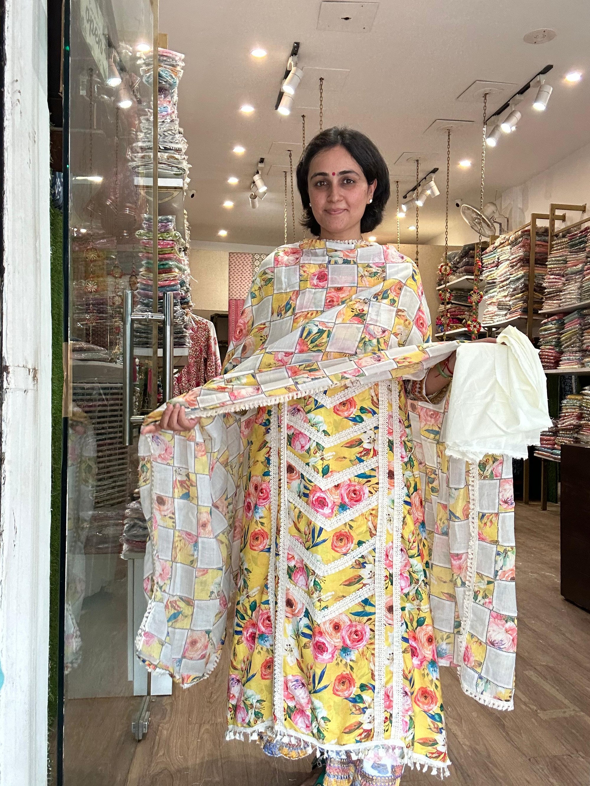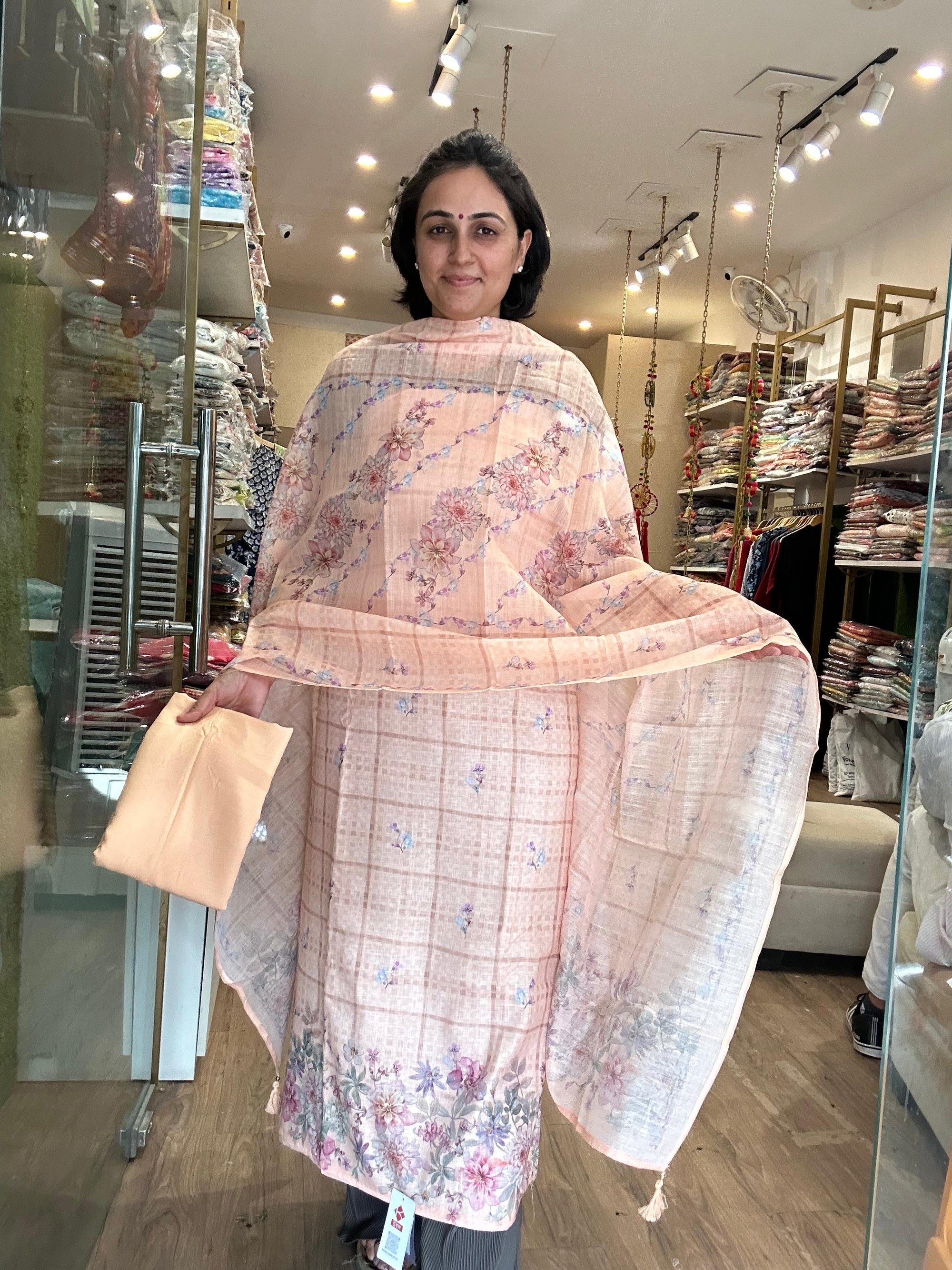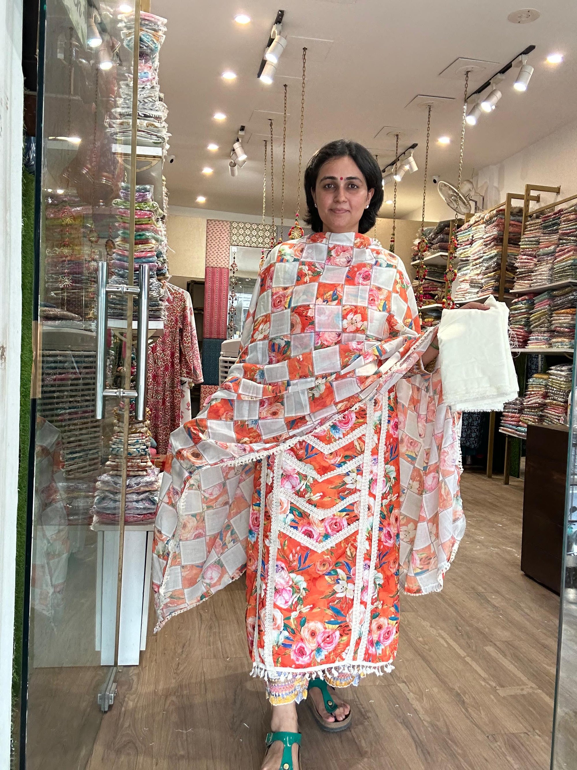 Elegant Cream Floral Printed Suit with chiffon Dupatta
