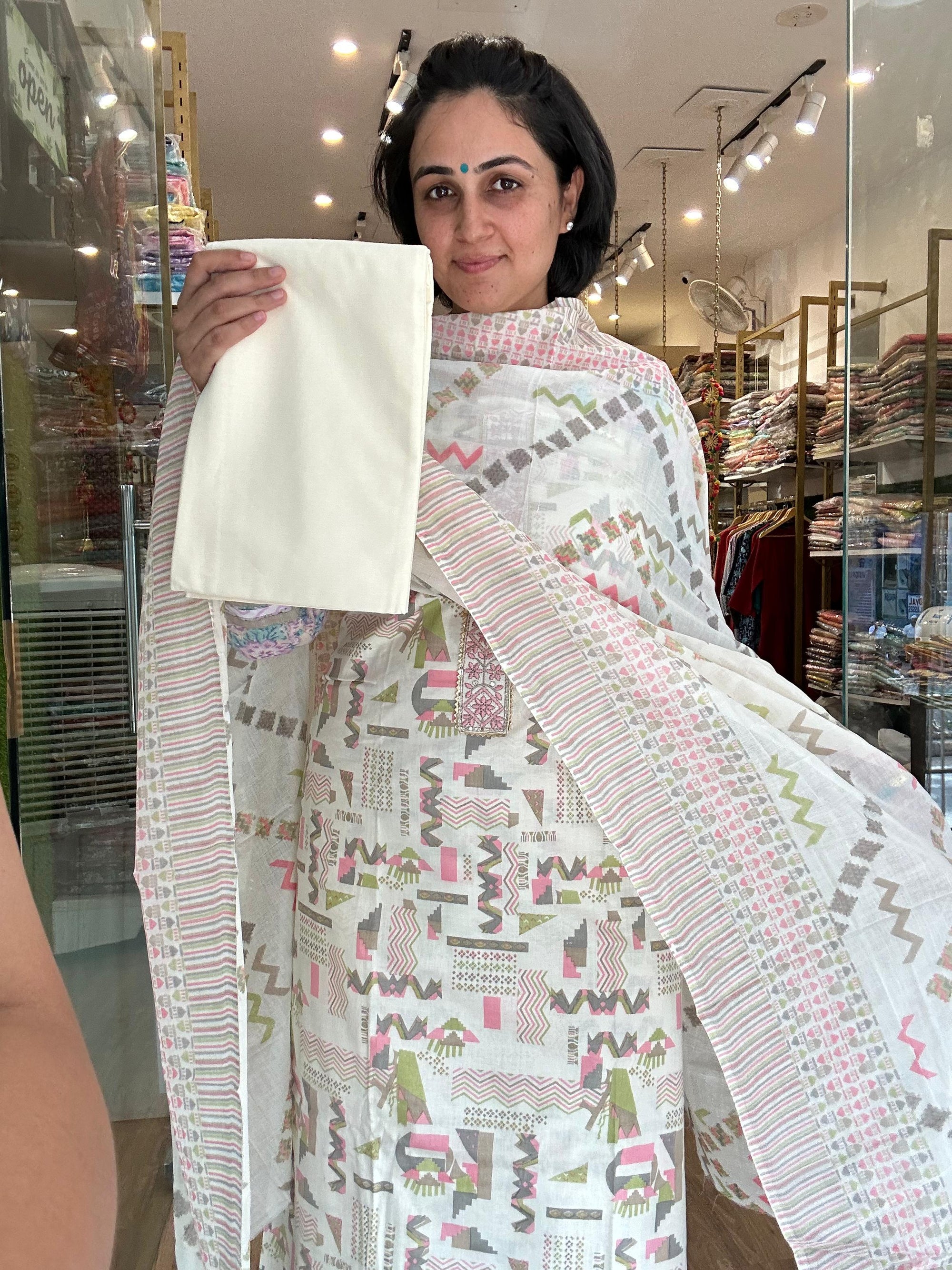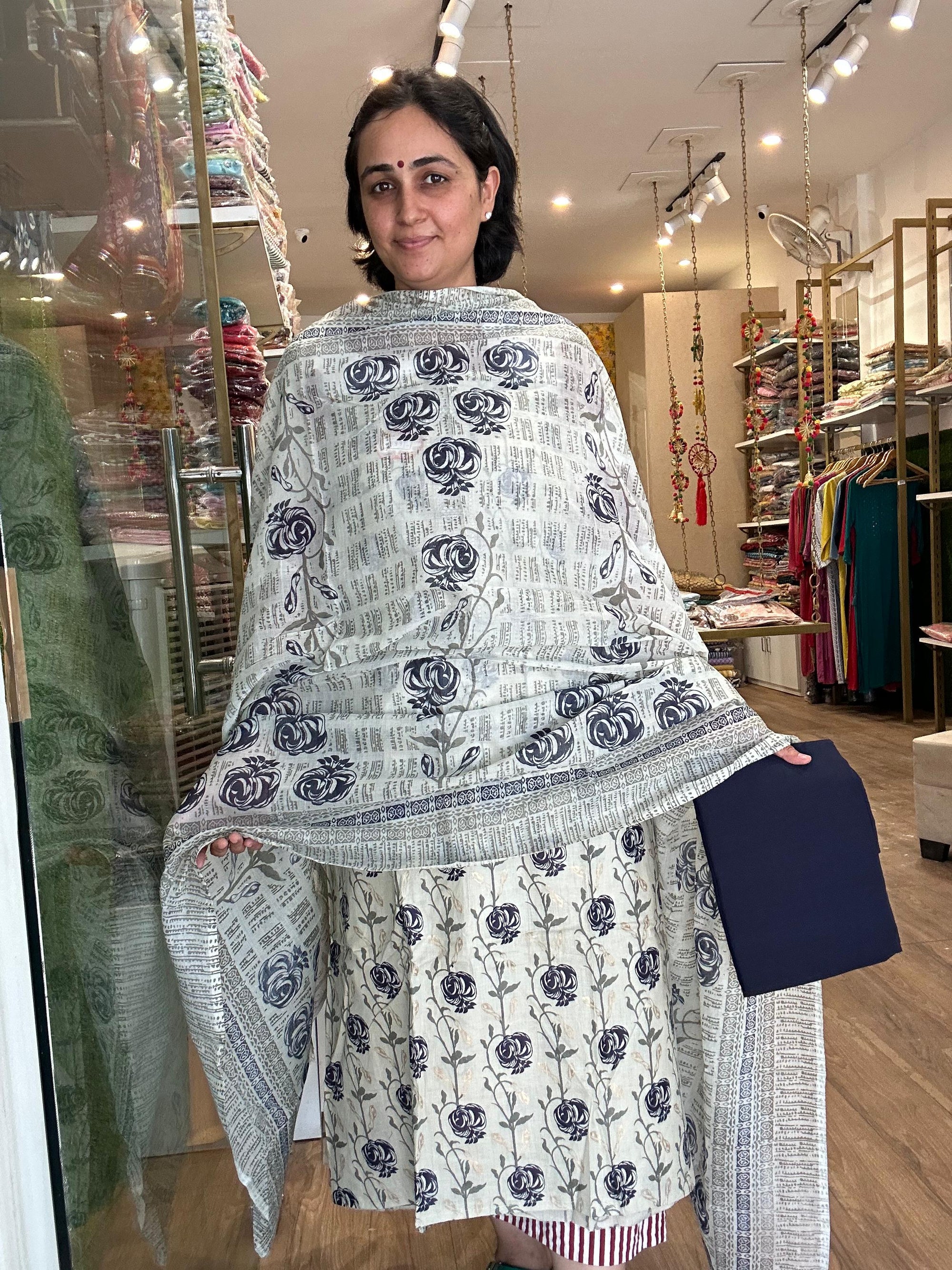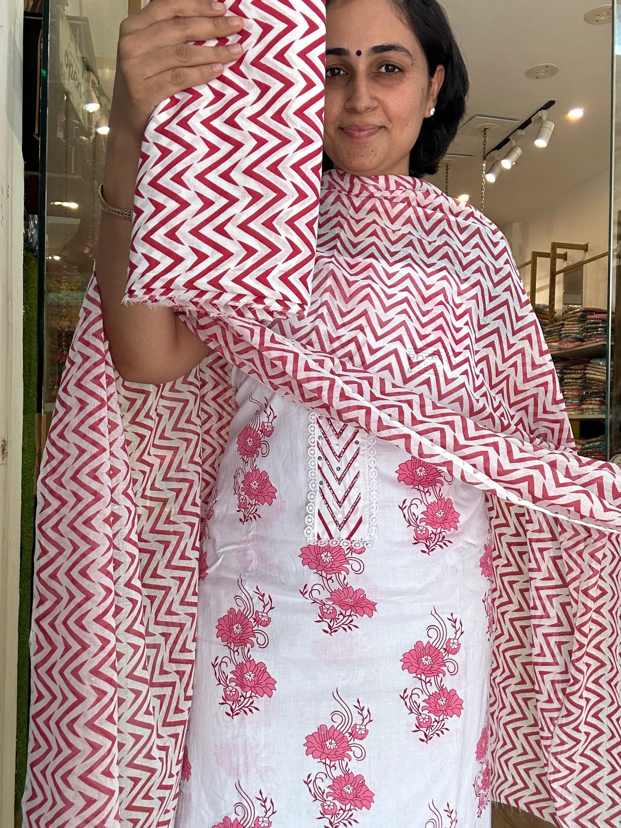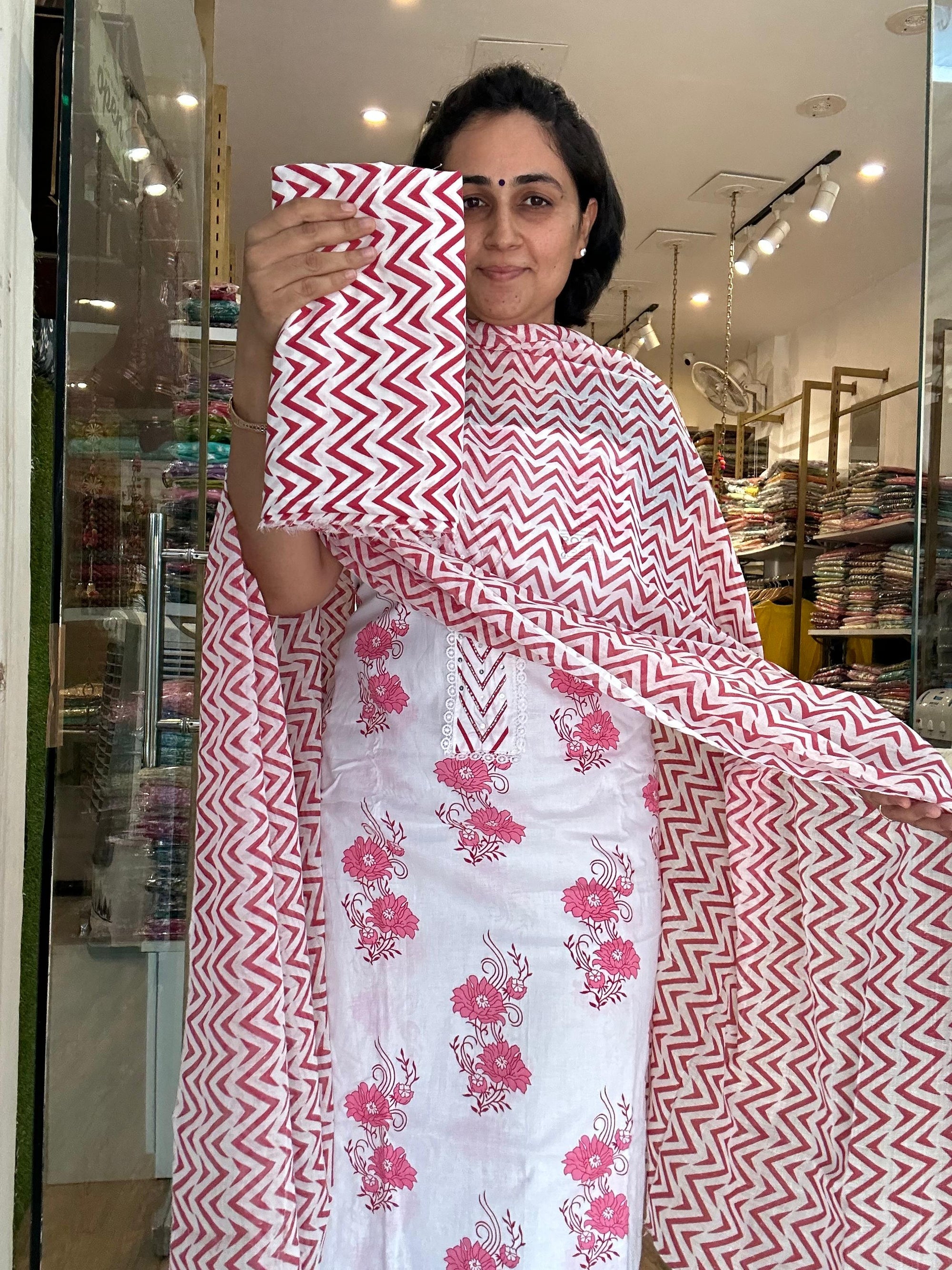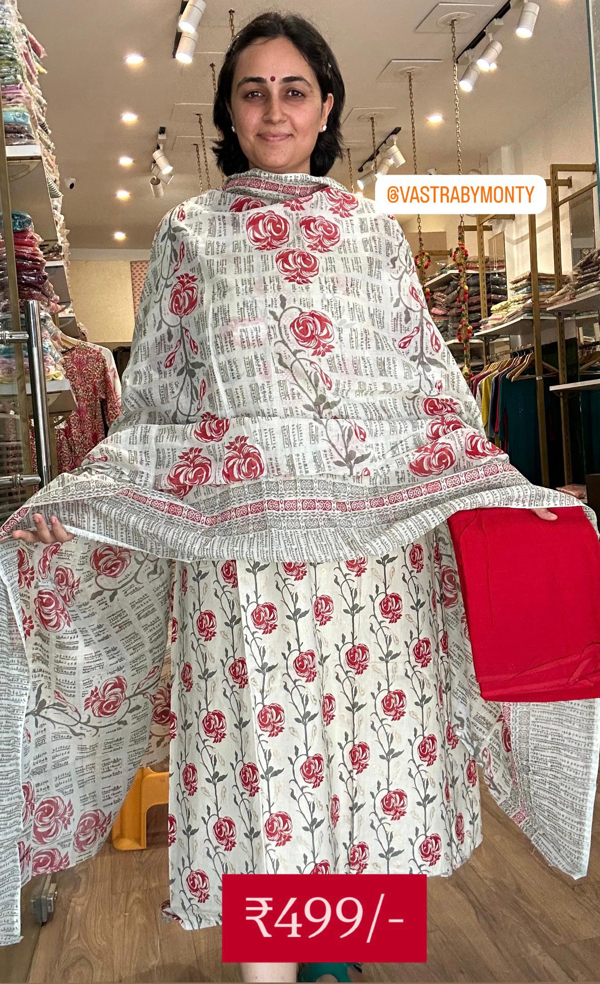 Indian Handloom Traditional Cotton Unstitched Suit Set – Rose Print on White Base with Colour Options | 5m Suit + 2.5m Dupatta | VastraByMonty