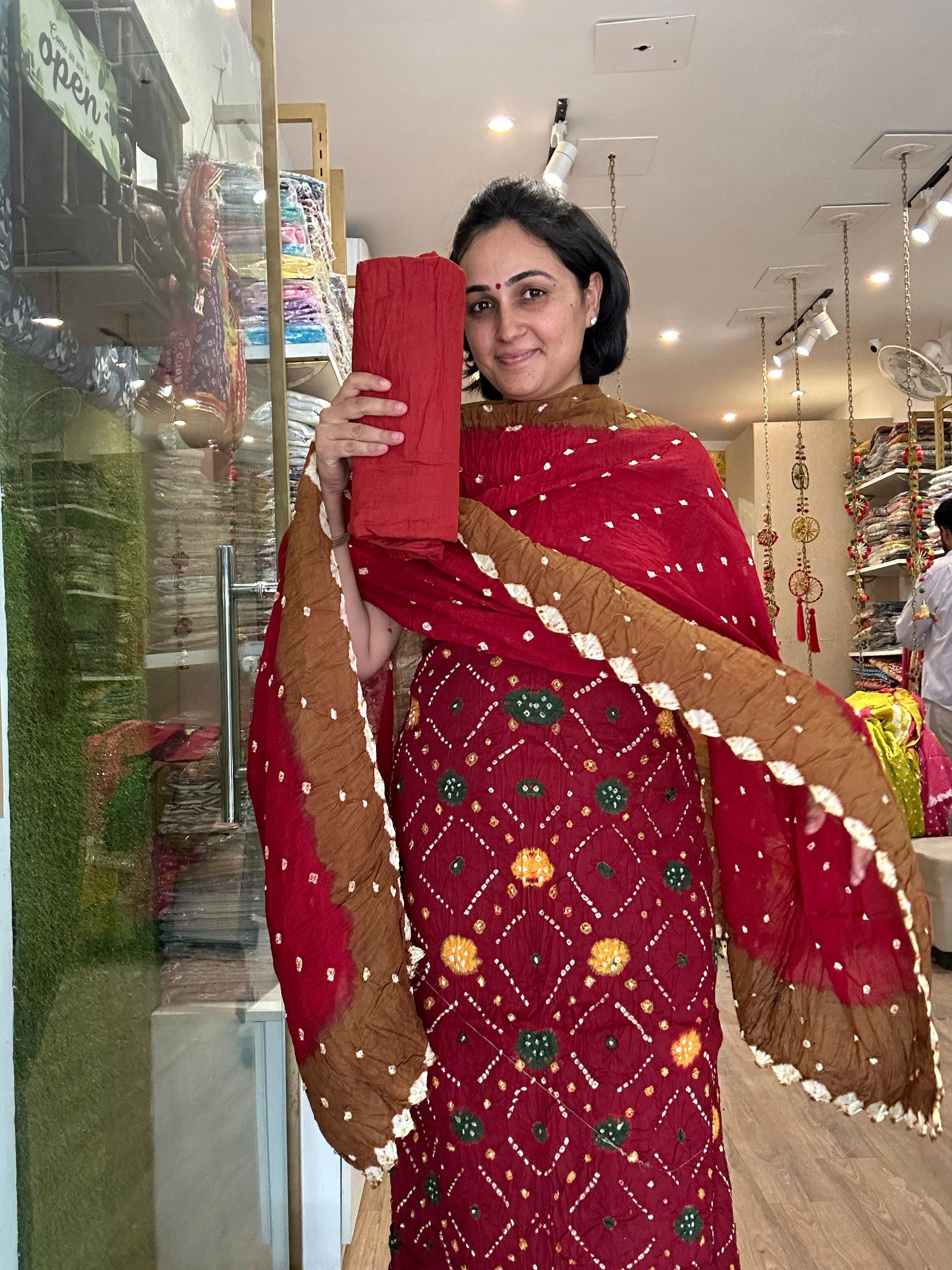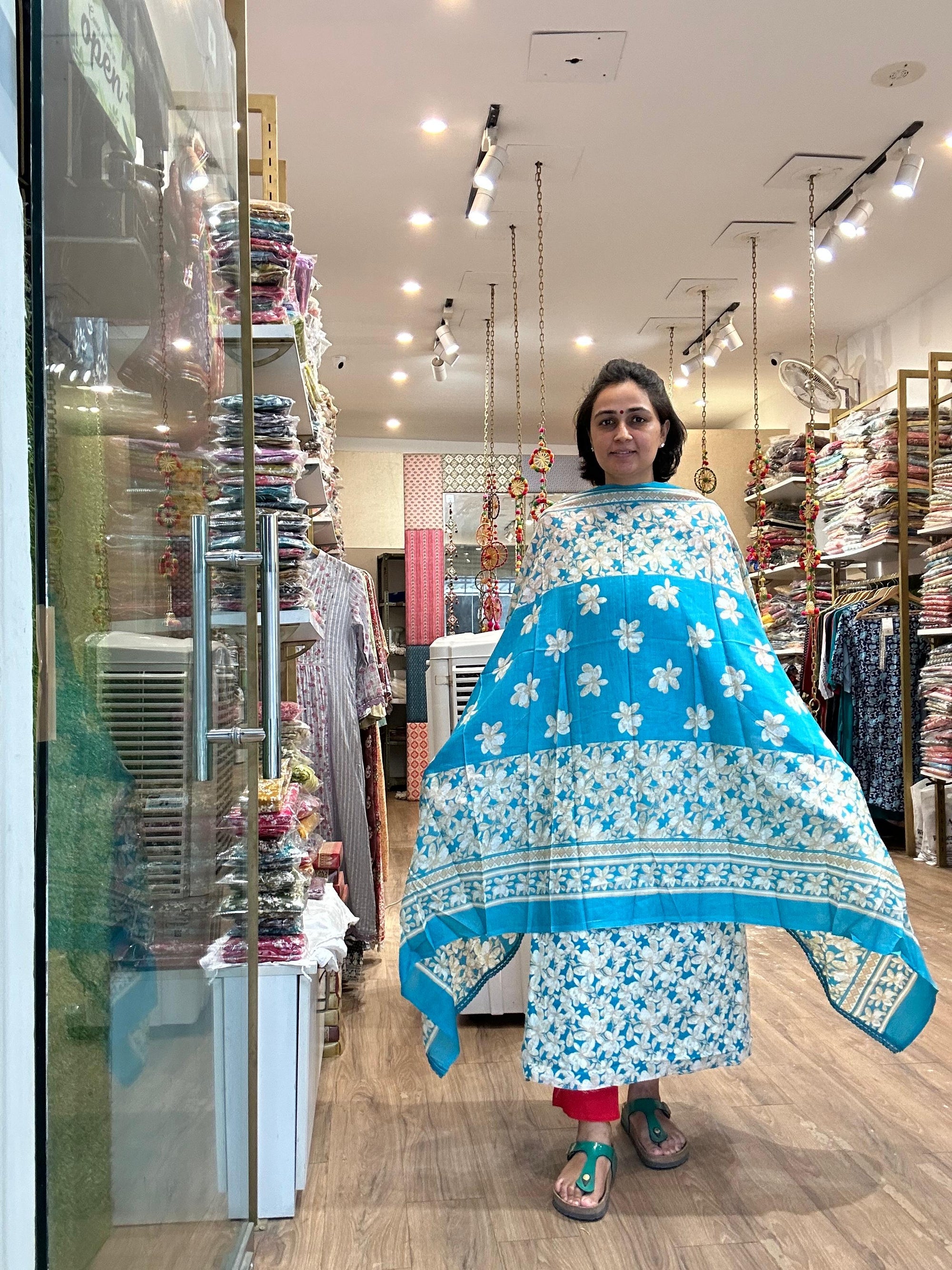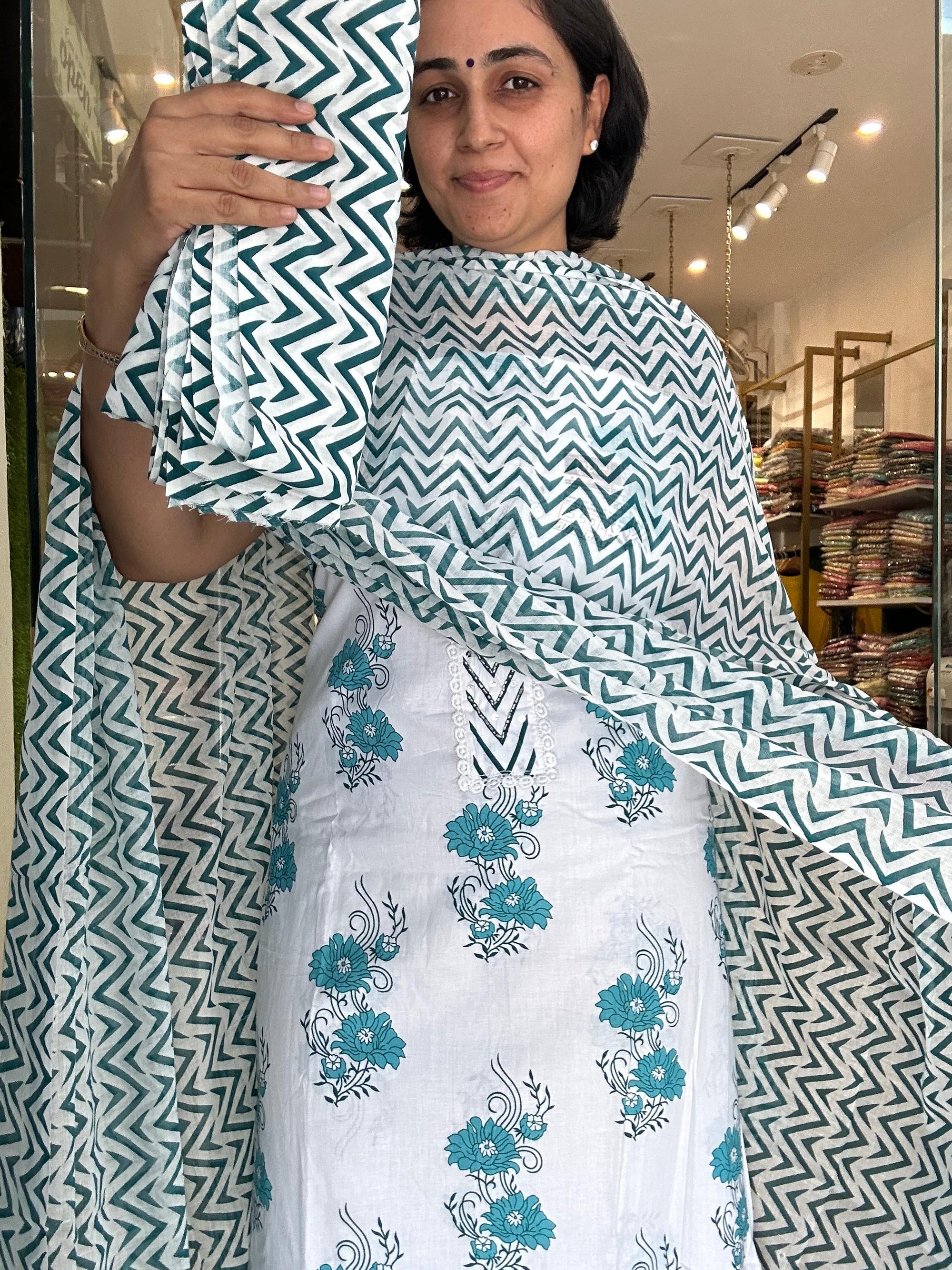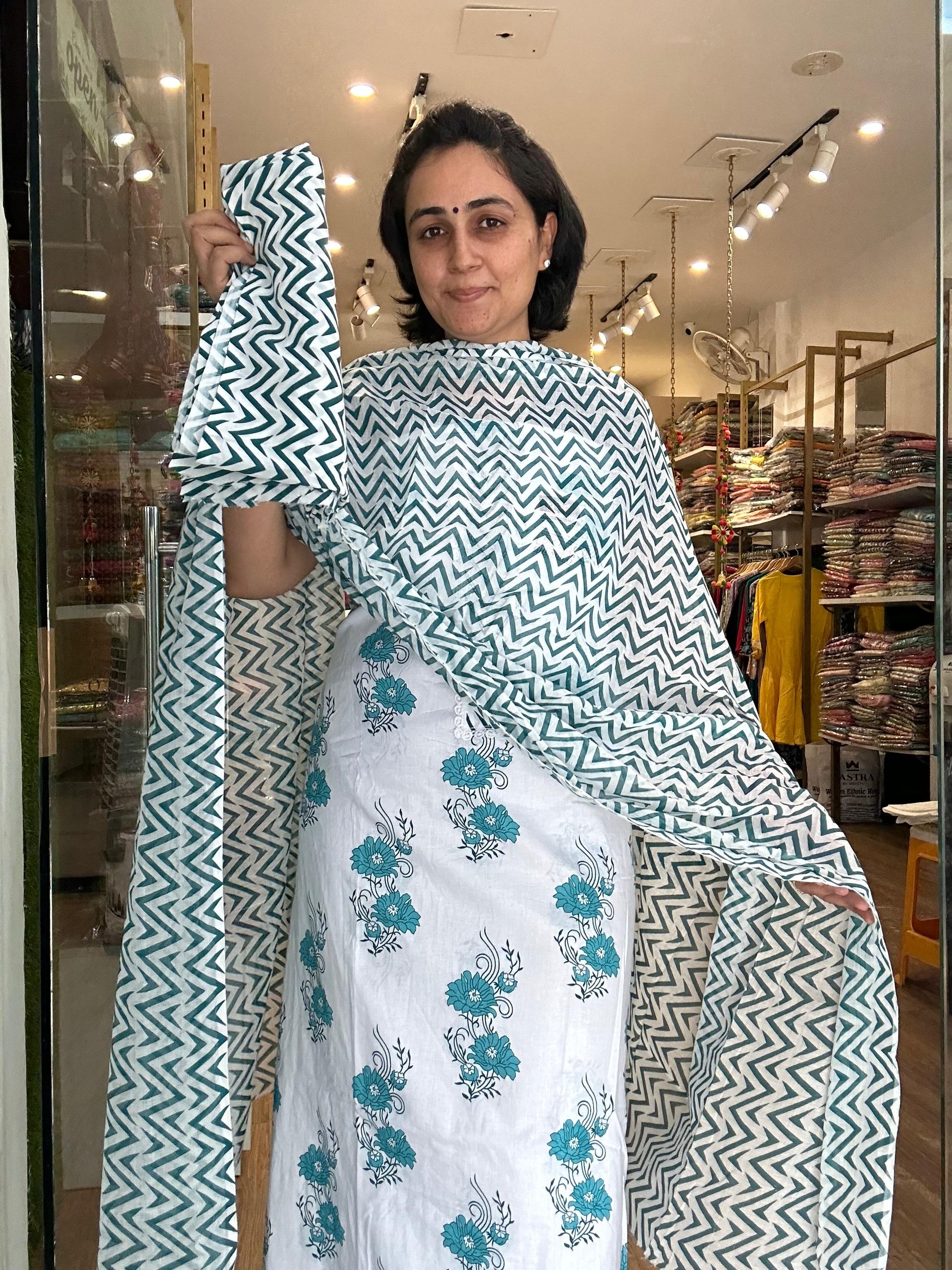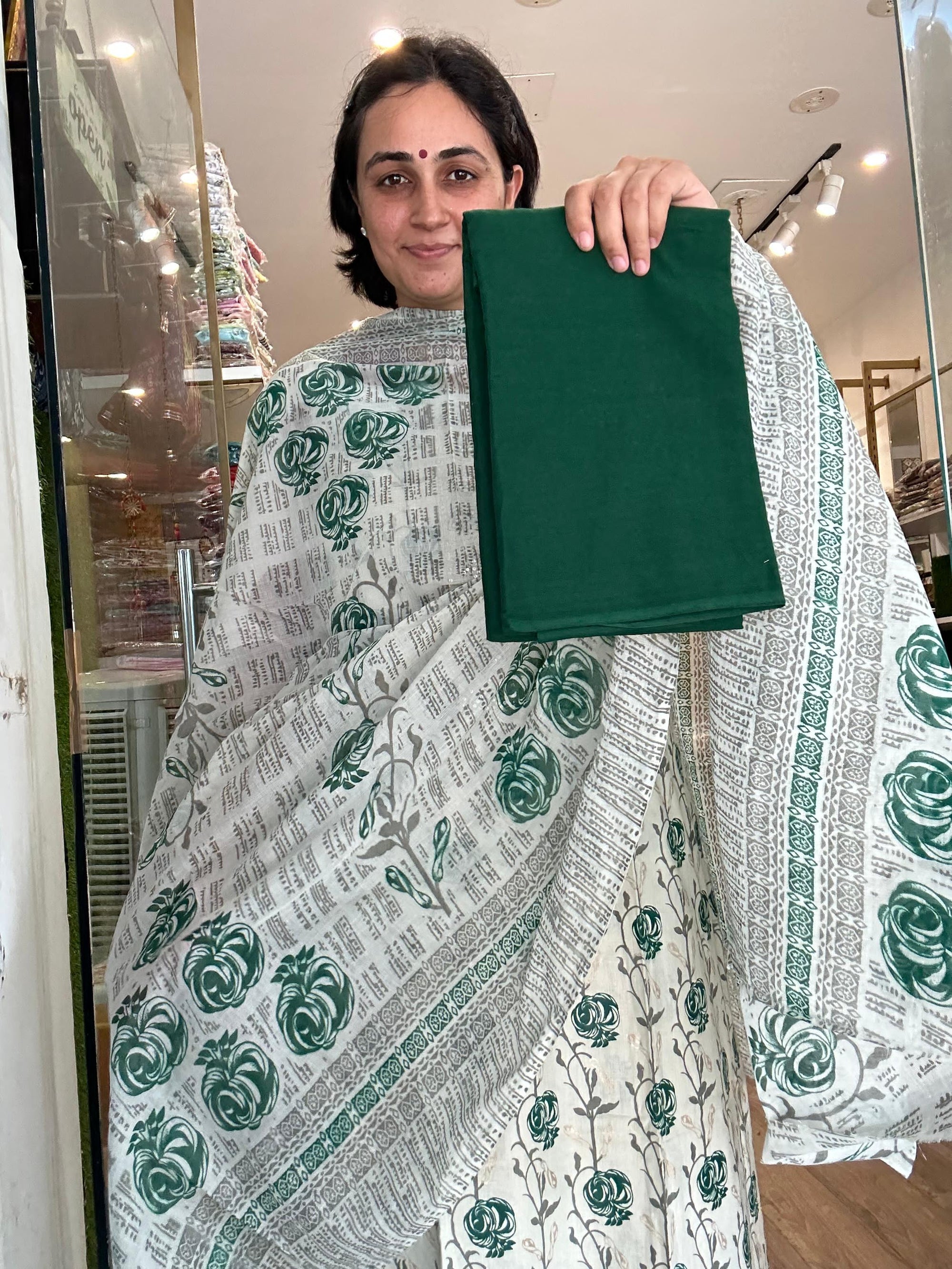 Indian Handloom Traditional Cotton Unstitched Suit Set – Rose Print on White Base with Colour Options | 5m Suit + 2.5m Dupatta | VastraByMonty