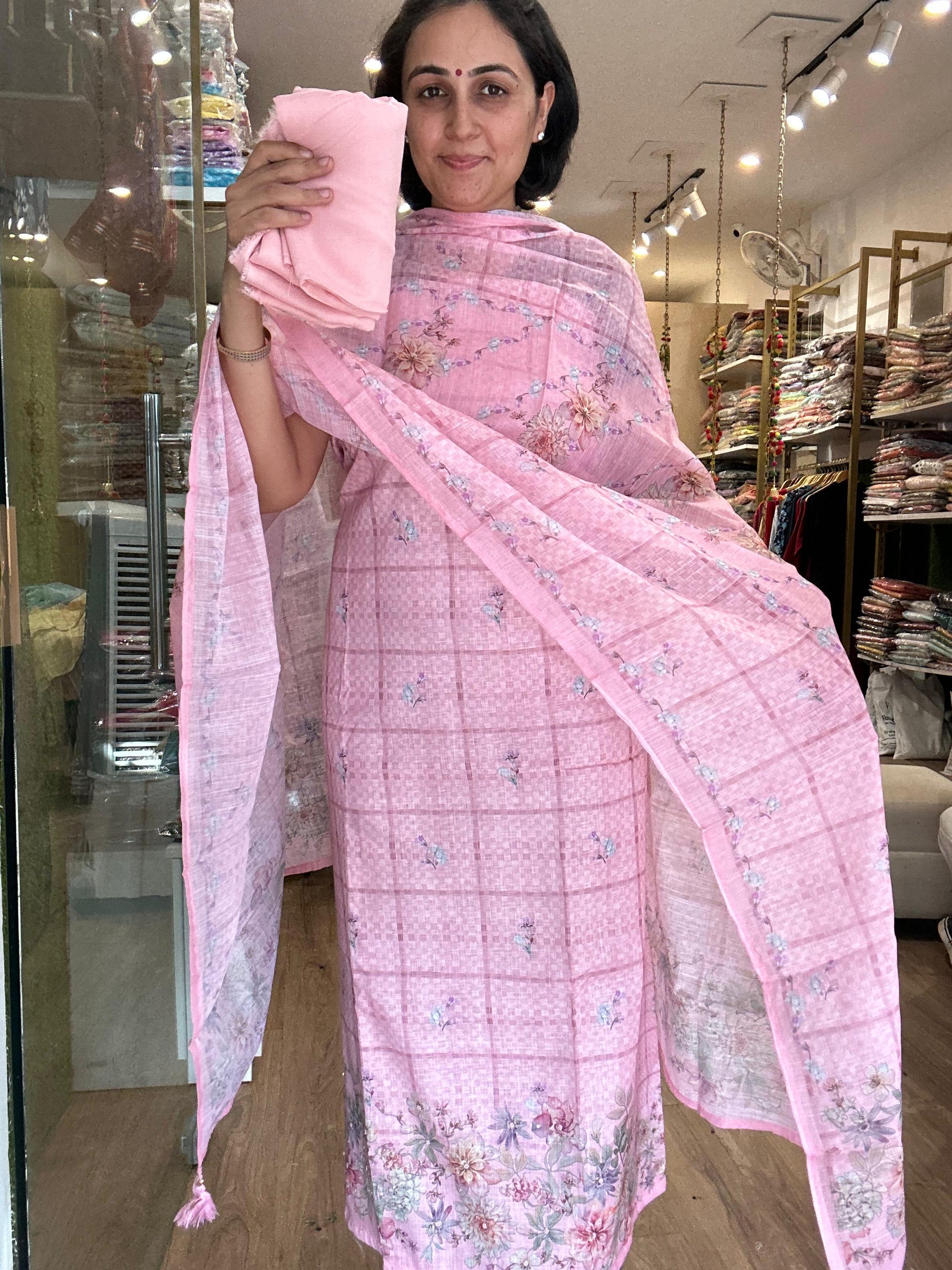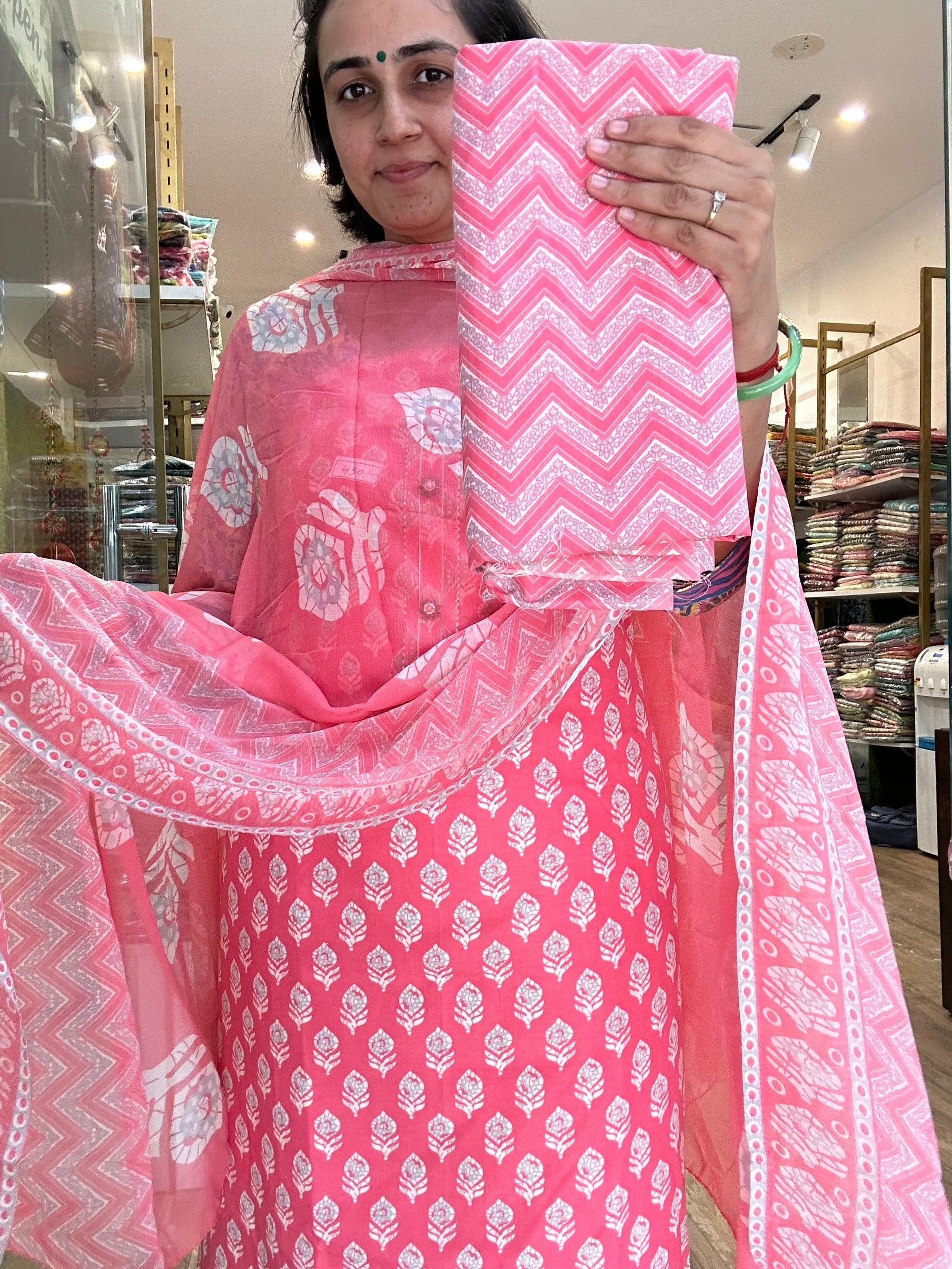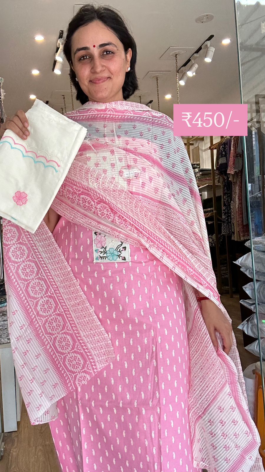 Blush Bloom Pink Cotton Suit Set with Floral Dupatta & Embroidered Bottom