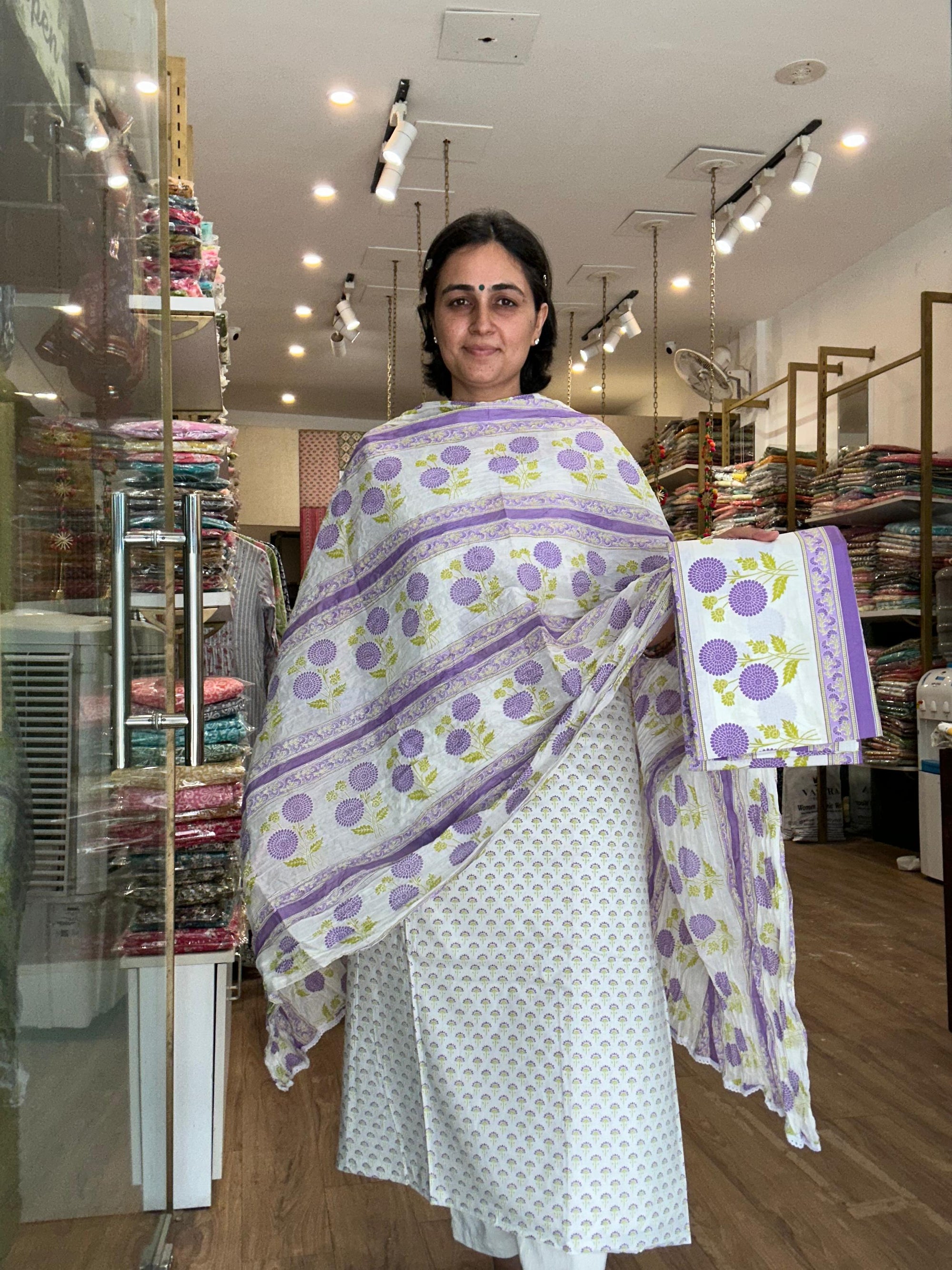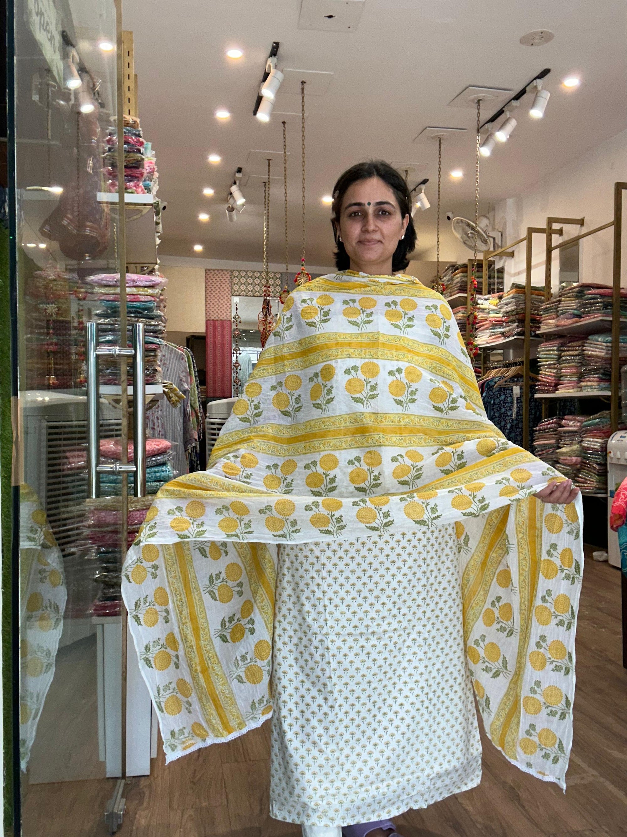 VastraByMonty “RangGul” Unstitched Handloom Cotton Suit Set – 5 Meter Suit Fabric + 2.5 Meter Dupatta | Rose Print on White Base with Traditional Border