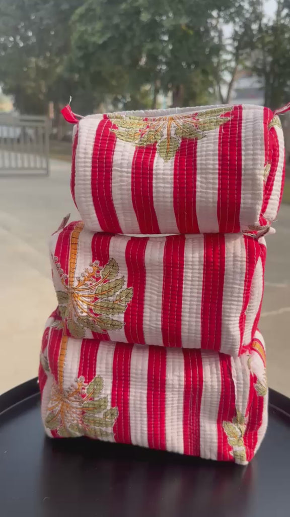 Organize your beauty essentials in style with our set of 3 hand block printed makeup pouches. Available in large, medium, and small sizes, each pouch is adorned with a printed lining for added charm.