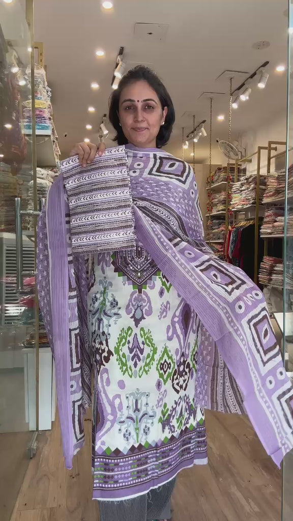 Unveil a story of calm elegance and rich tradition with our Lavender Grace Ikat-Inspired Cotton Suit Set. This ensemble is a tribute to timeless artistry, woven in soft pastel hues that speak volumes without saying a word.
